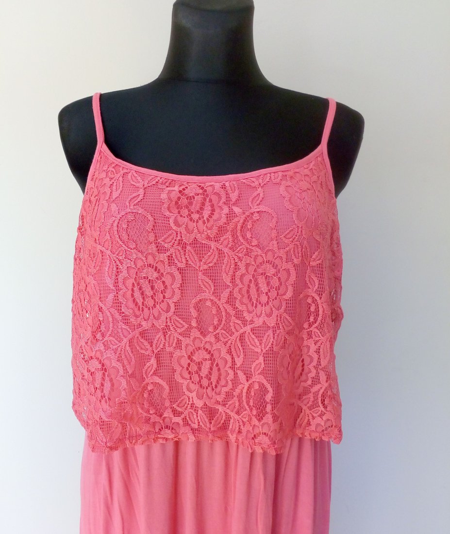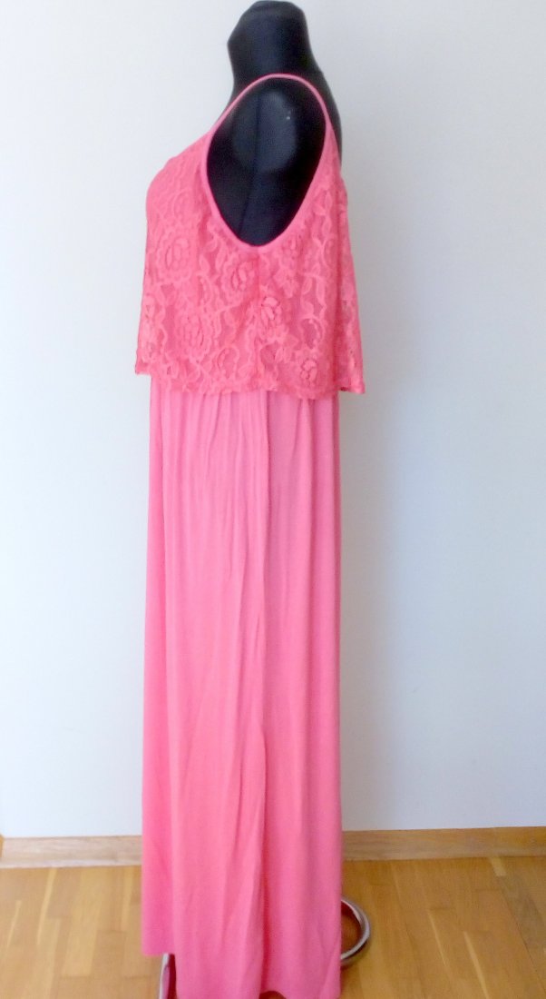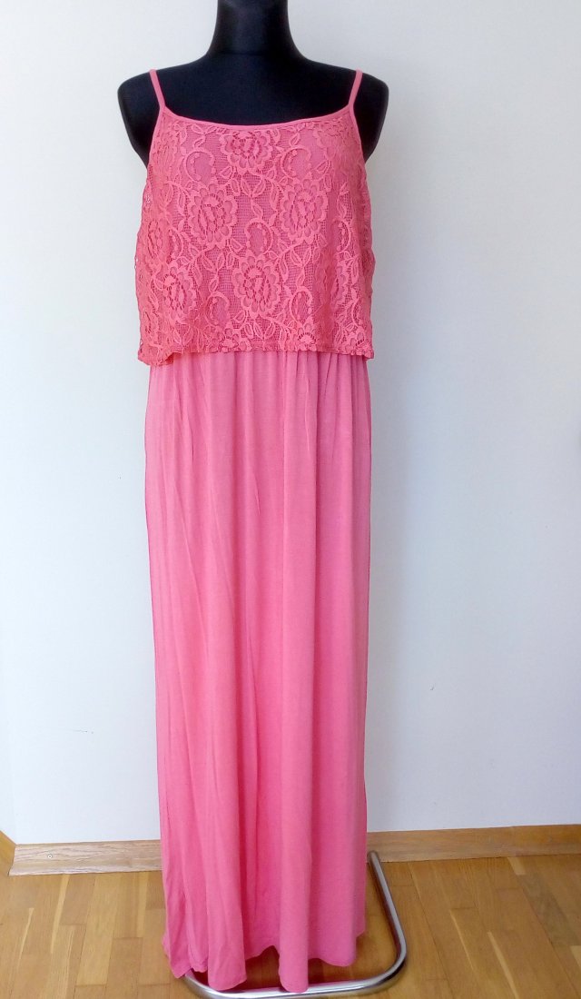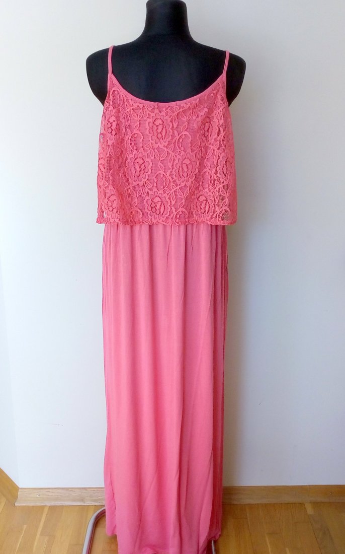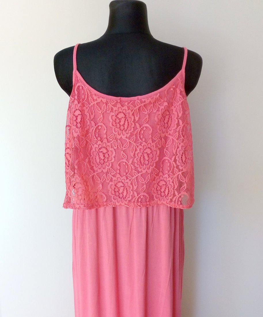 Maxi sukienka z dzianiny, w różowym kolorze, na ramiączkach, z koronkową falbaną, w pasie marszczona wszytą gumką