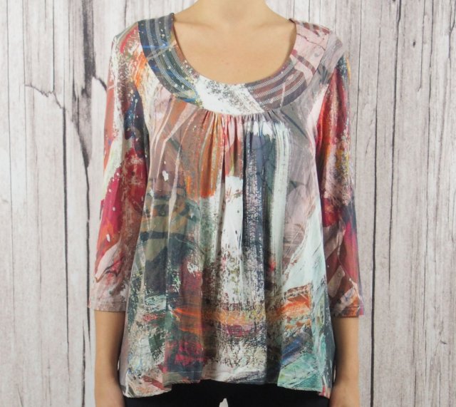 Tunika marki MONGUL. Z wiskozy z dodatkiem elastyny. Z nadrukiem wyglądającym niczym abstrakcyjny obraz.