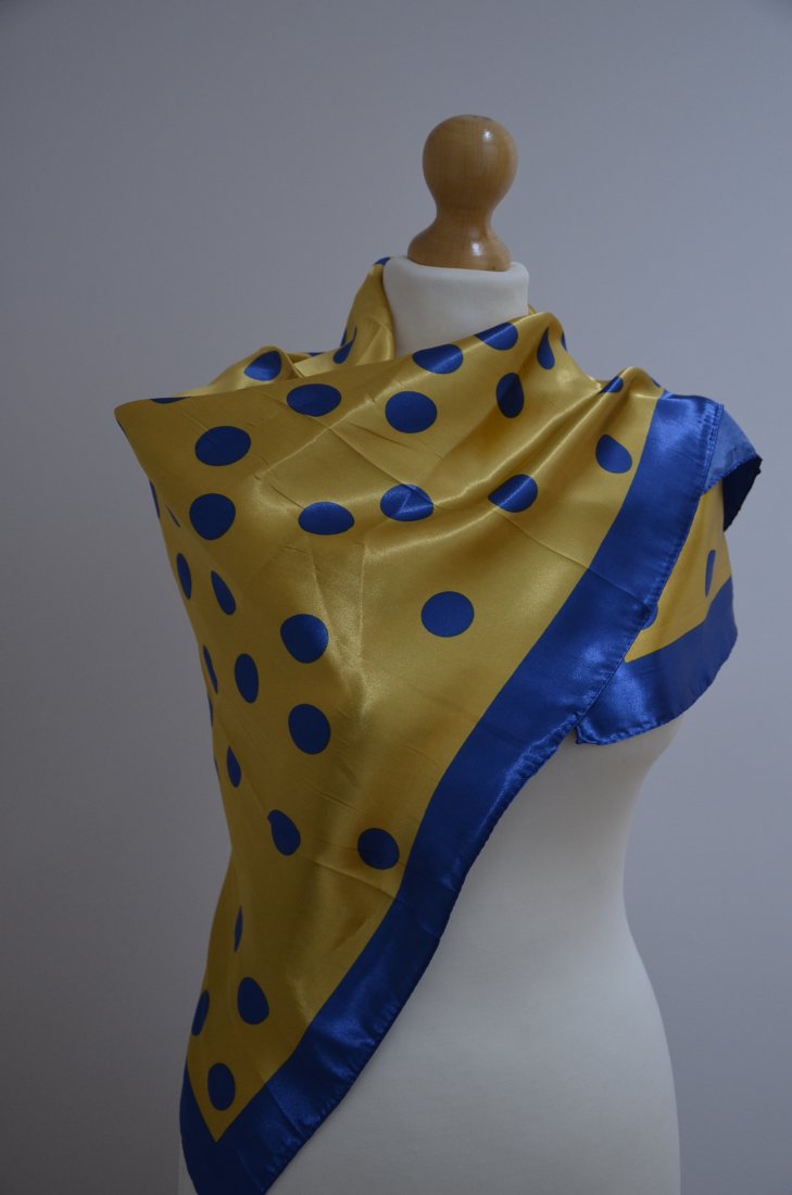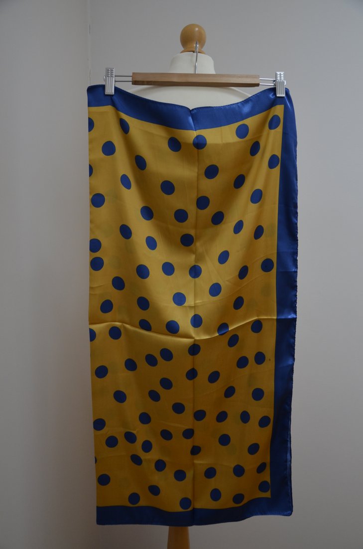 nowa apaszka/ chusta w grochy o wymiarach około 90cmx90cm; brak metki ze składem, prawdopodobnie poliester;