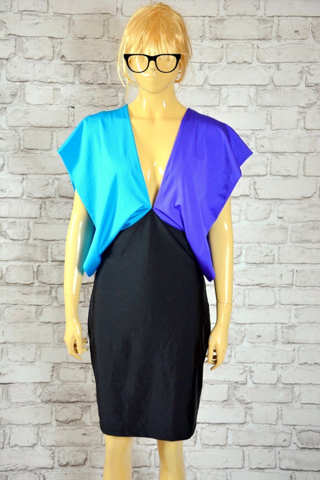 Nowa z metką sexy sukienka renomowanej marki Bohemia Couture, sukienka o fantazyjnym kroju utrzymana w czarno-fioletowo-turkusowej kolorystyce, góra sukienki z kolorowymi , szerokimi (ok 51 cm ) rękawami fantazyjnie skośnie opadającymi na ramiona i nie krępującymi ruchów, dekolt w szpic (głębszy ) zarówno z przodu jak i z tyłu, dół sukienki w kolorze czerni- dopasowany do figury, góra luźniejsza .