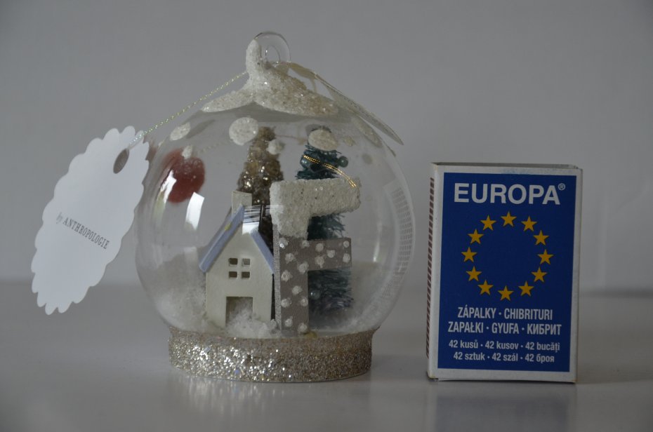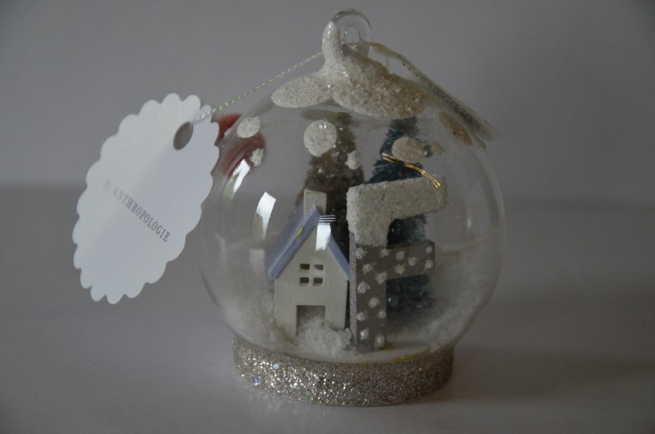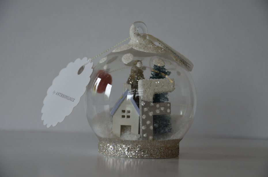 nowa bombka Anthropologie jak śnieżna kula, z monogramem, litera F