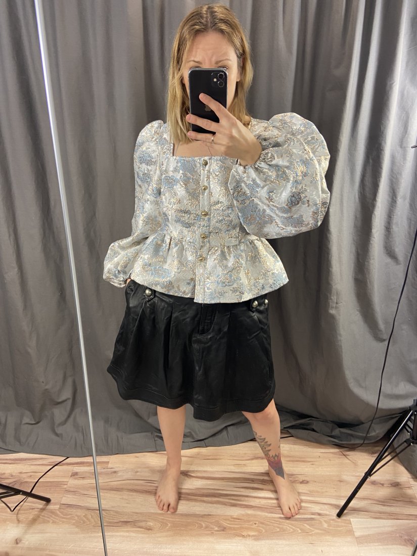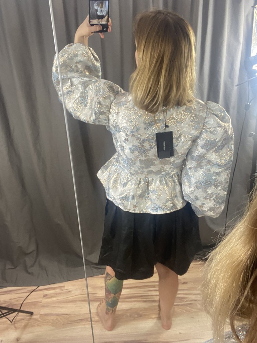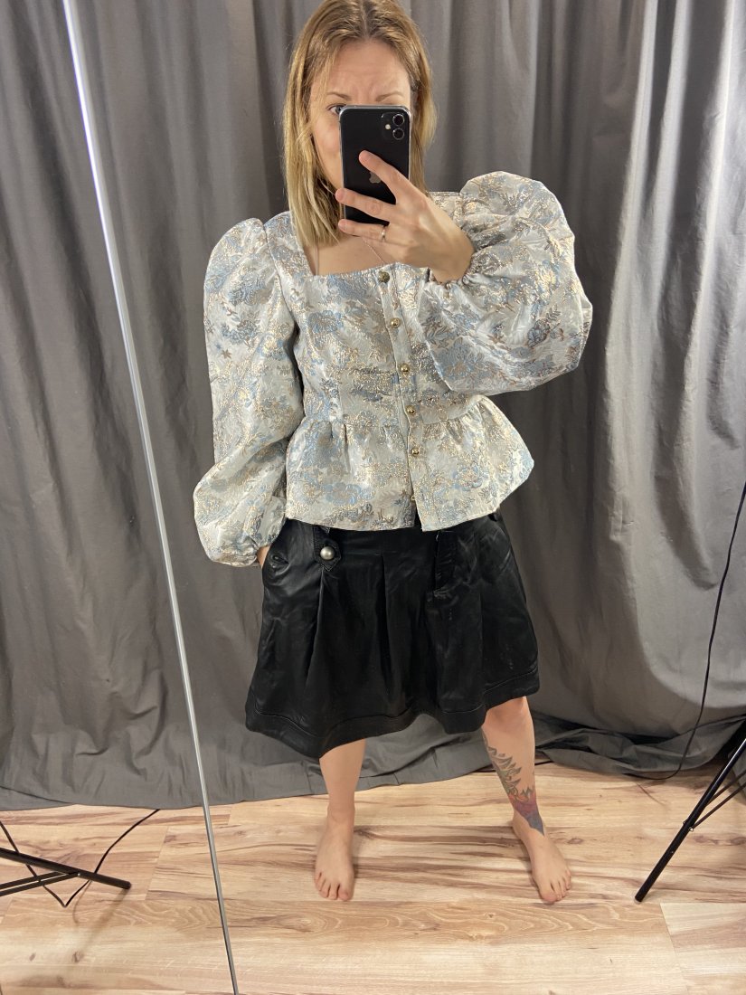 Boooskości bluzeczkowe. Cudo z ogromniastymi bufkami. 60% poliester, 30% nylon, 10% włókna metalizujące. Materiał imituje gobelin. Zapinana na guziczki.
