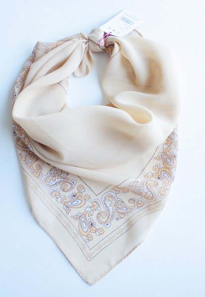 Kremowa subtelna chusta z papierową metką. Subtelne sygnowanie w odcieniu jasnego purowego różu.