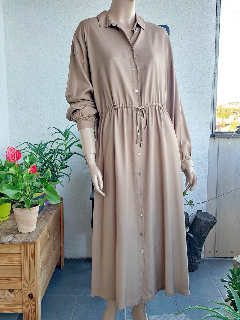 sukienka w kolorze beżowym, nowa z metkami. materiał100% wiskoza. fason prosty ze sznureczkiem w pasie, bez podszewki. rękawy można podpiąć. Rozmiar z metki 42, na manekinie 38.