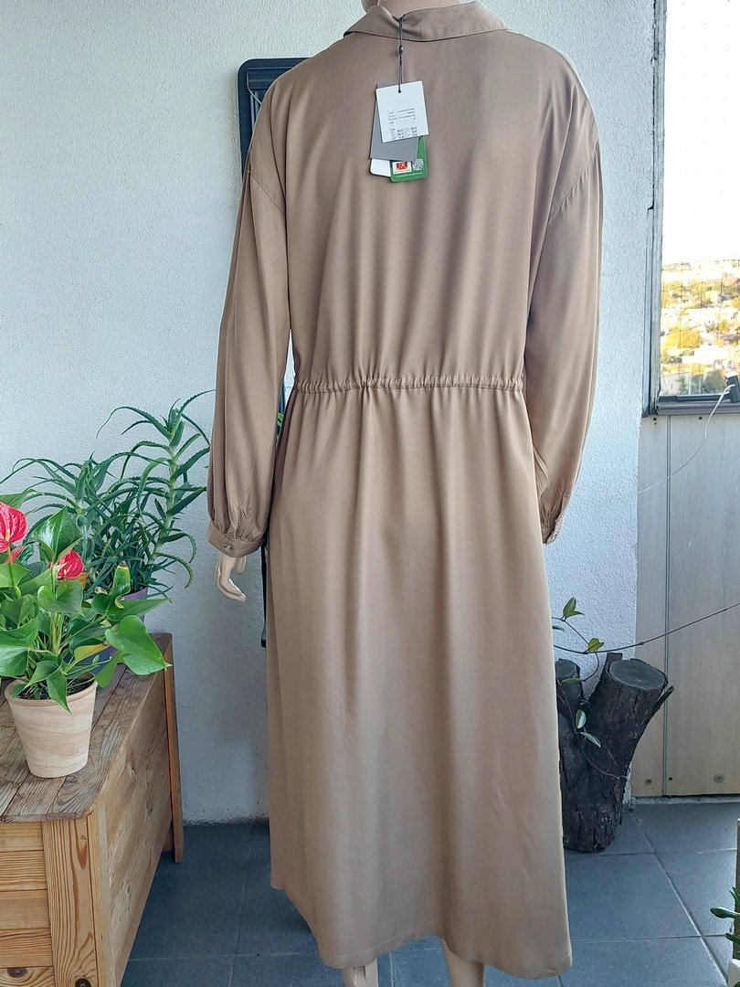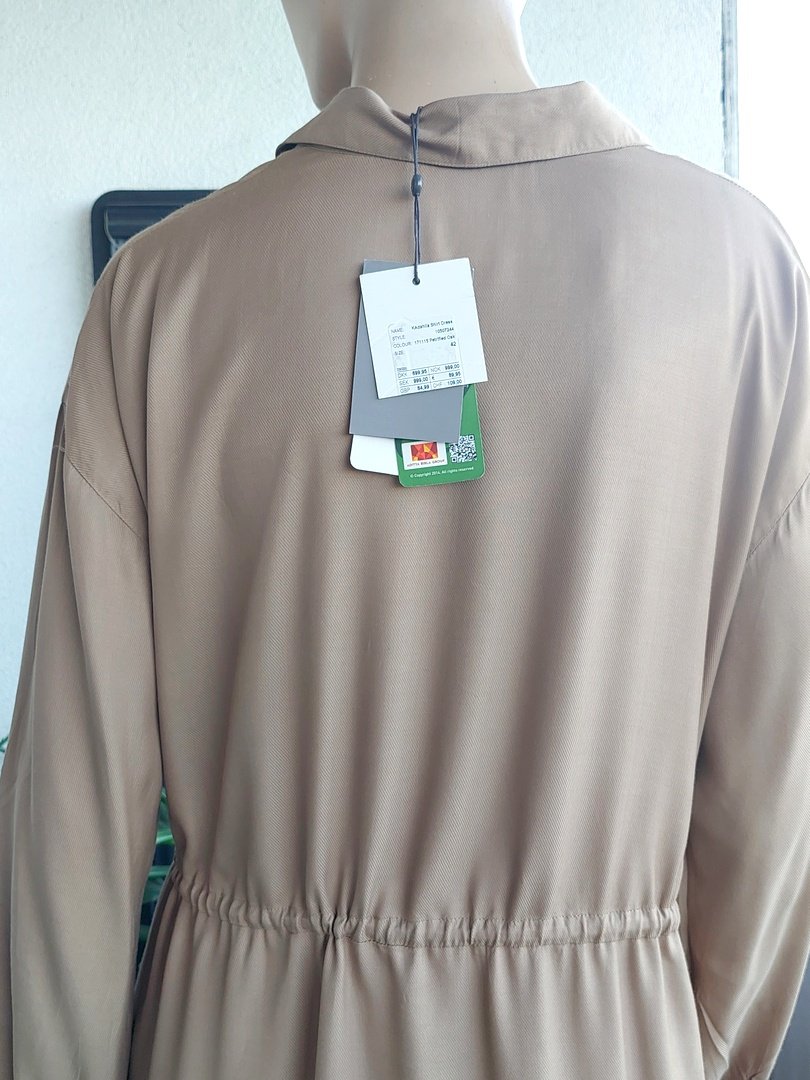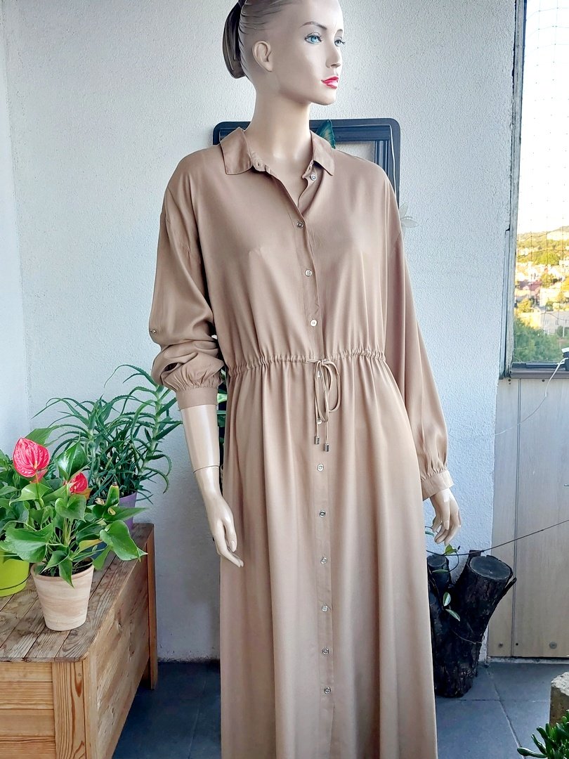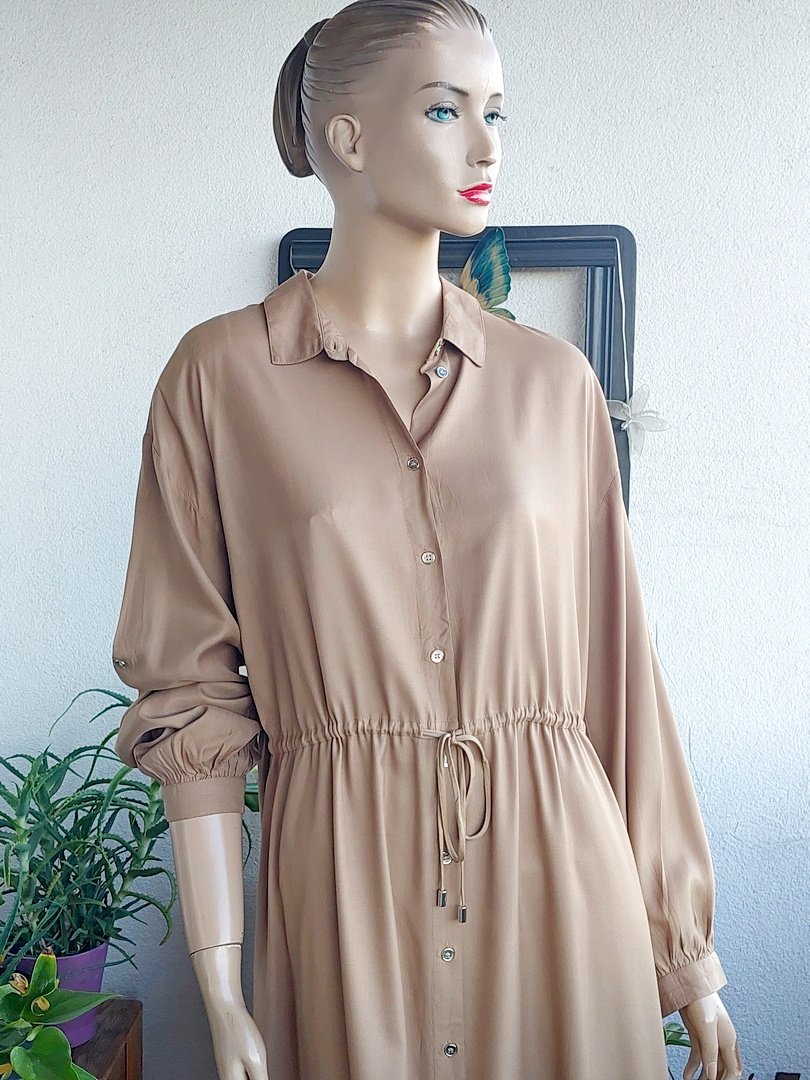 sukienka w kolorze beżowym, nowa z metkami. materiał100% wiskoza. fason prosty ze sznureczkiem w pasie, bez podszewki. rękawy można podpiąć. Rozmiar z metki 42, na manekinie 38.