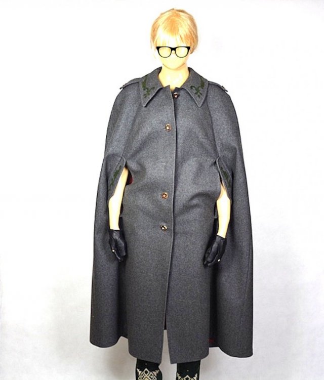 Przepiękna, nowa szara haftowana peleryna o dość luźnym, rozkloszowanym kroju, zapinana na guziki, pod szyją kołnierz, hafty umiejscowione przy kołnierzu i wycięciach na ręce.Peleryna wykonana z gładkiej wełny. Na kolorowej podszewce.