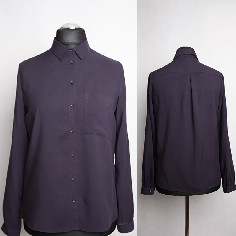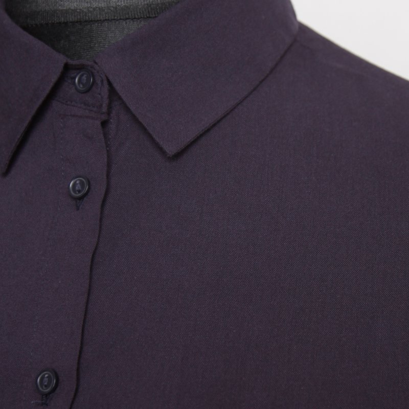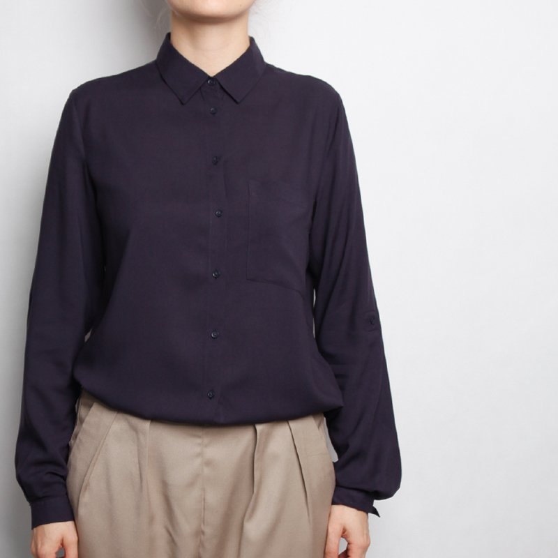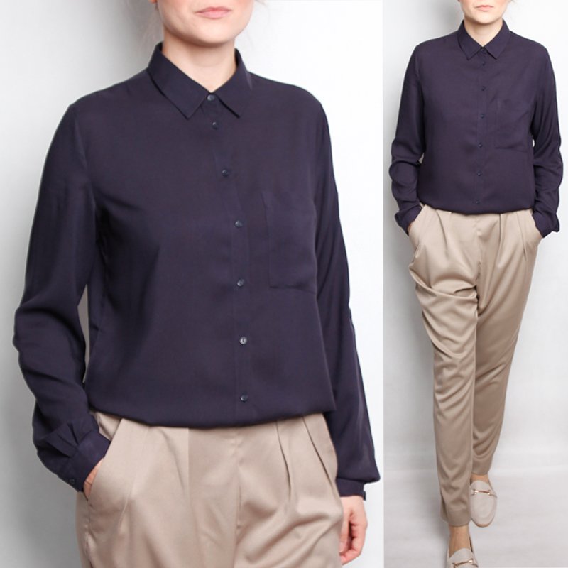 Klasyczna, damska koszula z granatowej wiskozy. Na piersi kieszeń, rękawy długie wykończone mankietem, z możliwością podwinięcia i zablokowania troczkami wewnątrz. Przyjemna, lejąca tkanina. Basic, który sprawdzi się w każdym zestawieniu, eleganckim do pracy, szkoły, jaki i na luzie z jeansami.