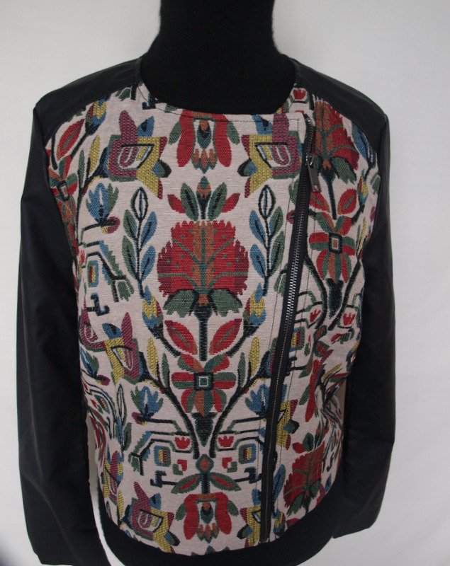 Krótka - do pasa -etniczna kurtka z gobelinowej tkaniny łączonej z czarną eko skórą, na czarnej podszewce. Zapinana na zamek błyskawiczny - zapięcie asymetryczne. Zamkami wykończone są również rękawy.