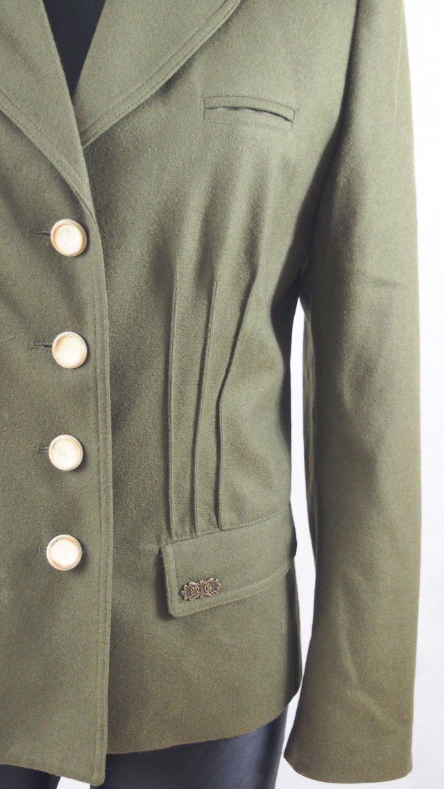 Marynarka niemieckiej produkcji. Bardzo stylowo skrojona, pięknie wykończona. Z drewnianymi guzikami. 80% czysta wełna, 20% nylon, podszewka 100% acetat.