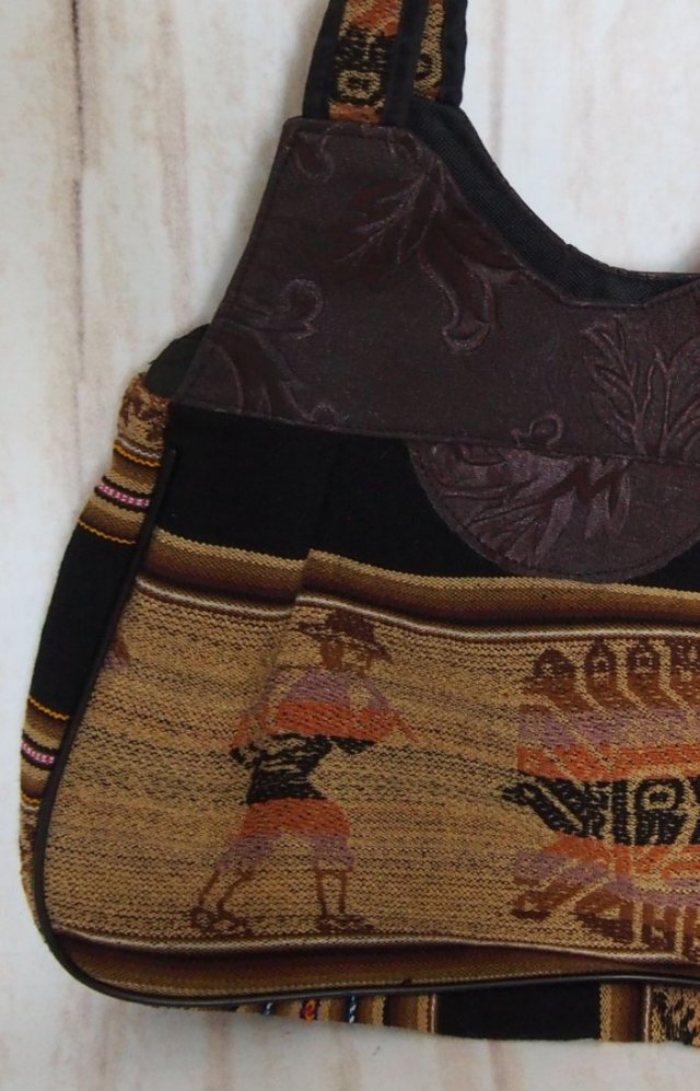 Etno płócienna torebka. Zapinana na zamek, jednokomorowa. Do ręki lub na ramię.