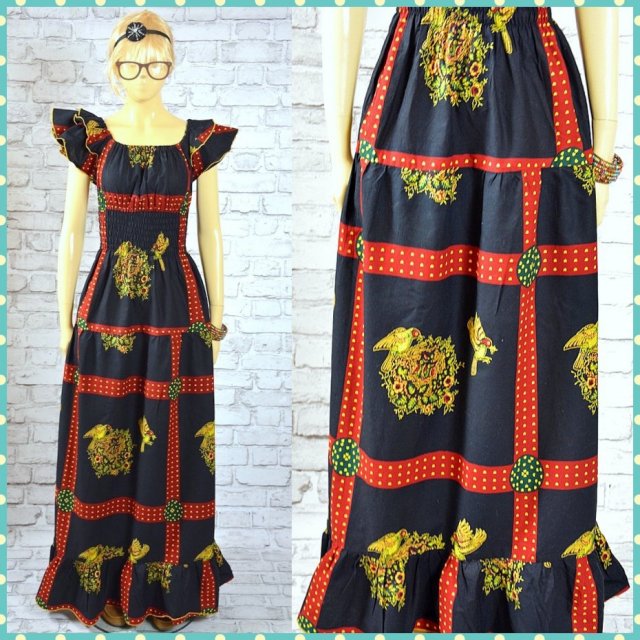 WYPRZEDAŻ.Piekna dostojna maxi sukienka zdobiona w printy ptaków i kwiatów, sukienka o rozkloszowanym kroju ,od lini biustu aż do pasa marszczona guma (taki sam tył ), dół falbaniasty -rękawy również.Sukienka wykonana z nieelastycznej, doskonale trzymającej fason bawełny.