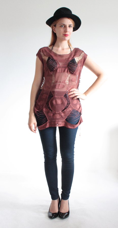 Wspaniała czekoladowa bluzka o ażurowej fakturze marki PIECES. Nowa, z metką. Cena na metce: 16,95 EUR, czyli ponad 70 zł.