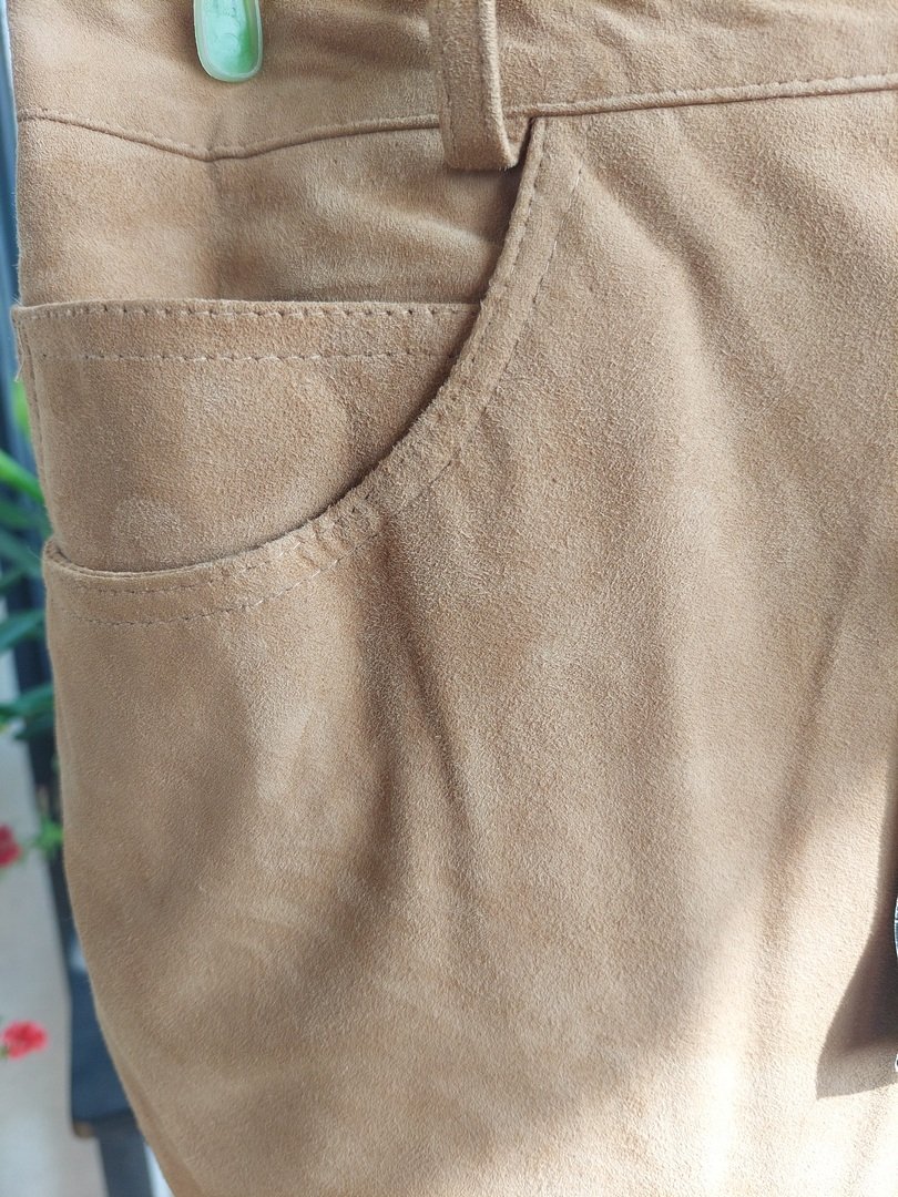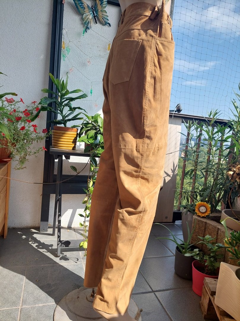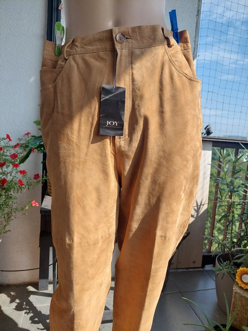 spodnie marki joy w kolorze beżowym, z naturalnej mięciutkiej skóry nubukowej (zamszowej?). krój wysokim stanem. nogawka bardzo delikatnie zwężająca się. pod spodem podszewka za kolano. rozmiar z metki 44. proszę sprawdzić wymiary. stan nowe z metką. Podaję wymiary mierzone na płasko: