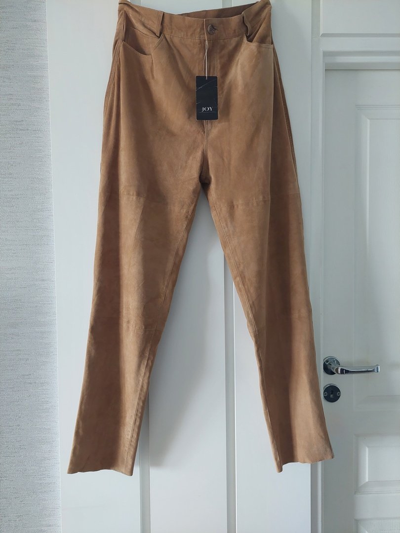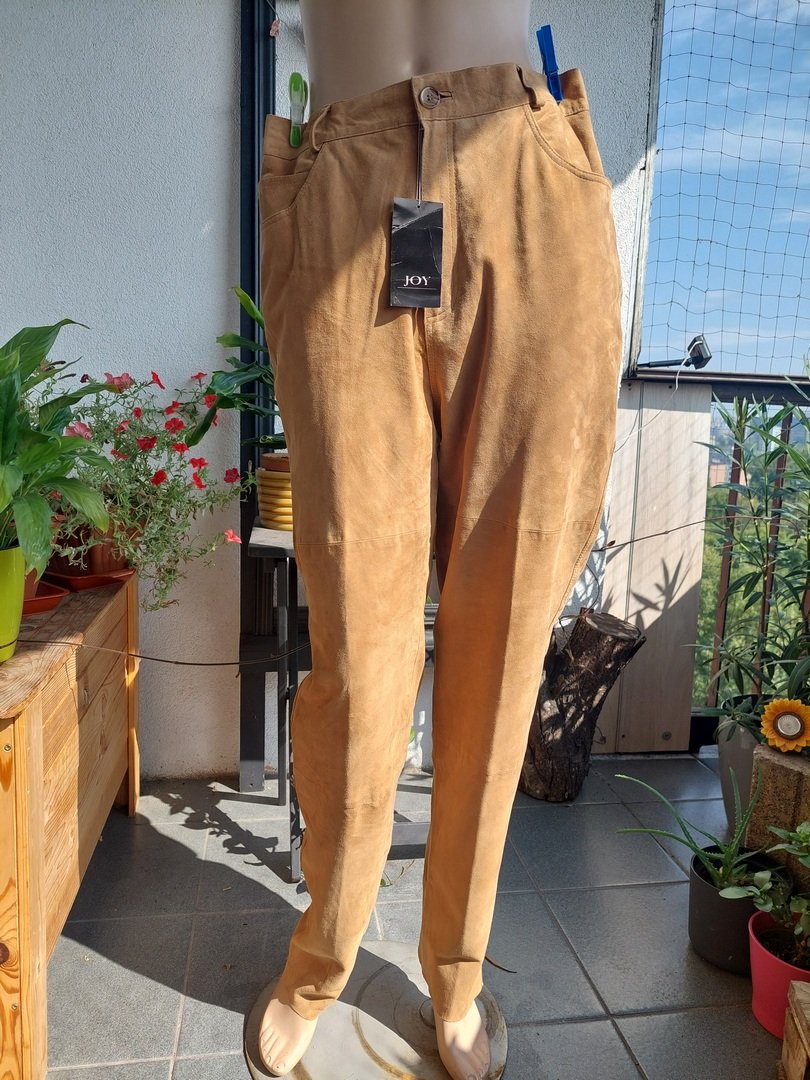 spodnie marki joy w kolorze beżowym, z naturalnej mięciutkiej skóry nubukowej (zamszowej?). krój wysokim stanem. nogawka bardzo delikatnie zwężająca się. pod spodem podszewka za kolano. rozmiar z metki 44. proszę sprawdzić wymiary. stan nowe z metką. Podaję wymiary mierzone na płasko: