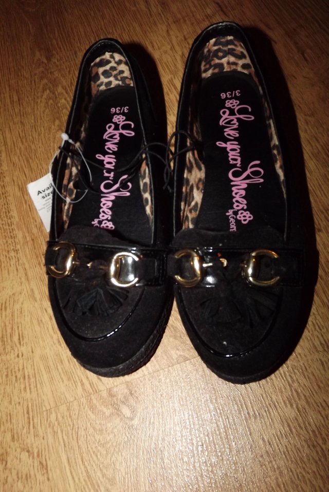 Nowe mokasyny firmy George. Wnętrze buta w panterkę.