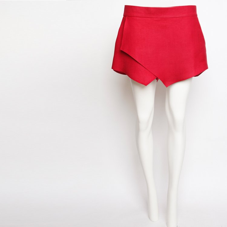 Krótkie spodenki z asymetrycznym, zakładanym przodem, po bokach kieszenie, tył na gumce, w kolorze winnej czerwieni.