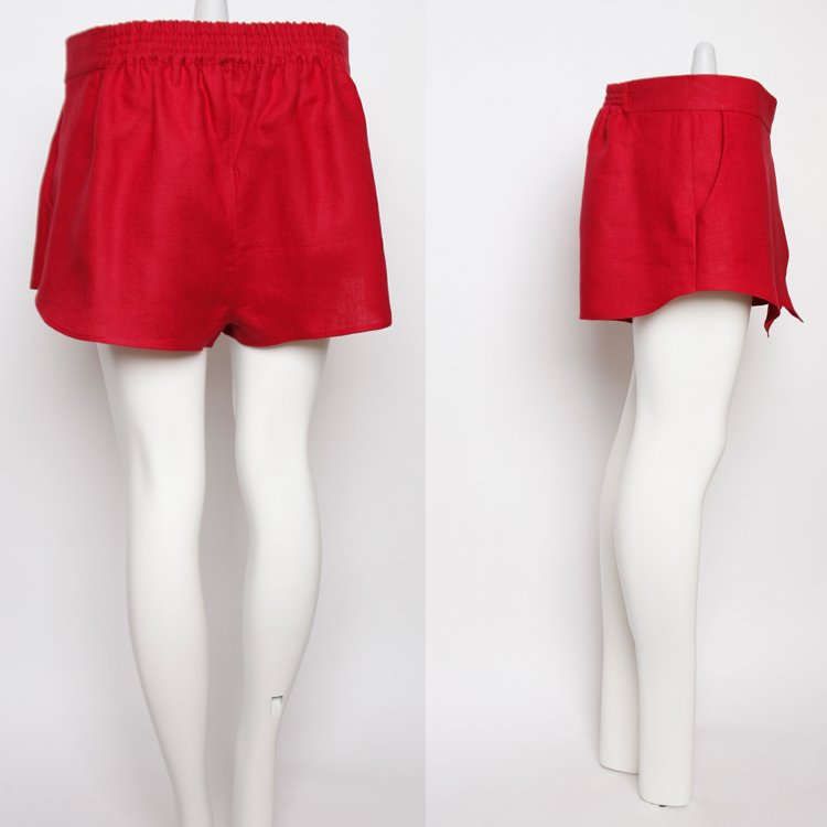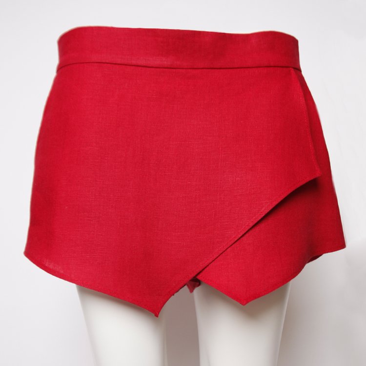 Krótkie spodenki z asymetrycznym, zakładanym przodem, po bokach kieszenie, tył na gumce, w kolorze winnej czerwieni.