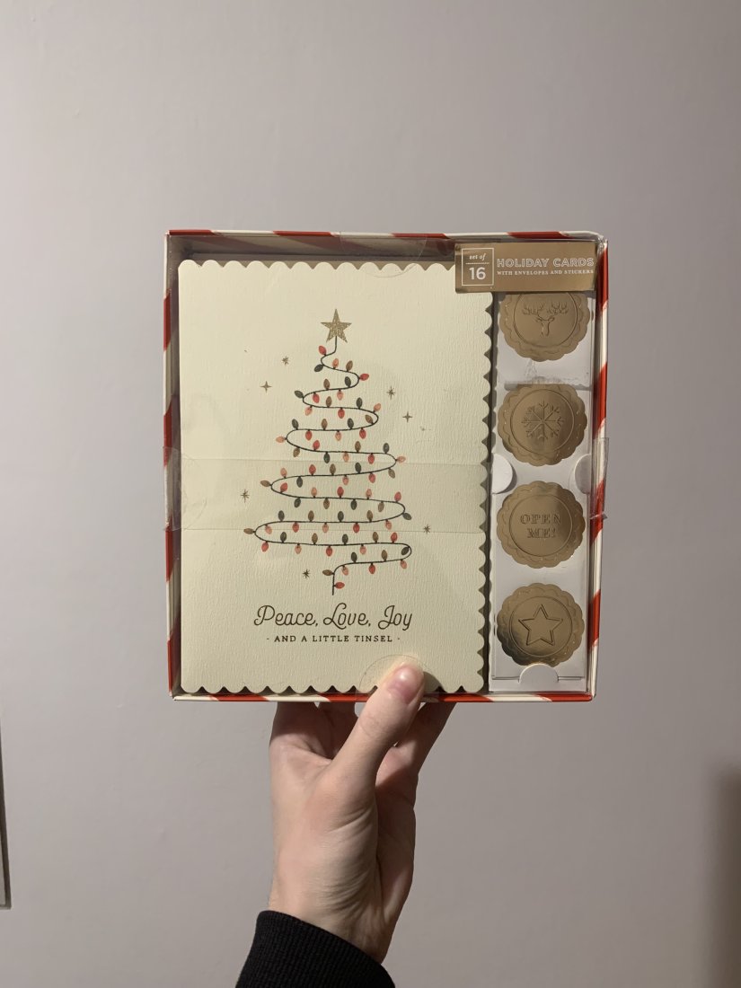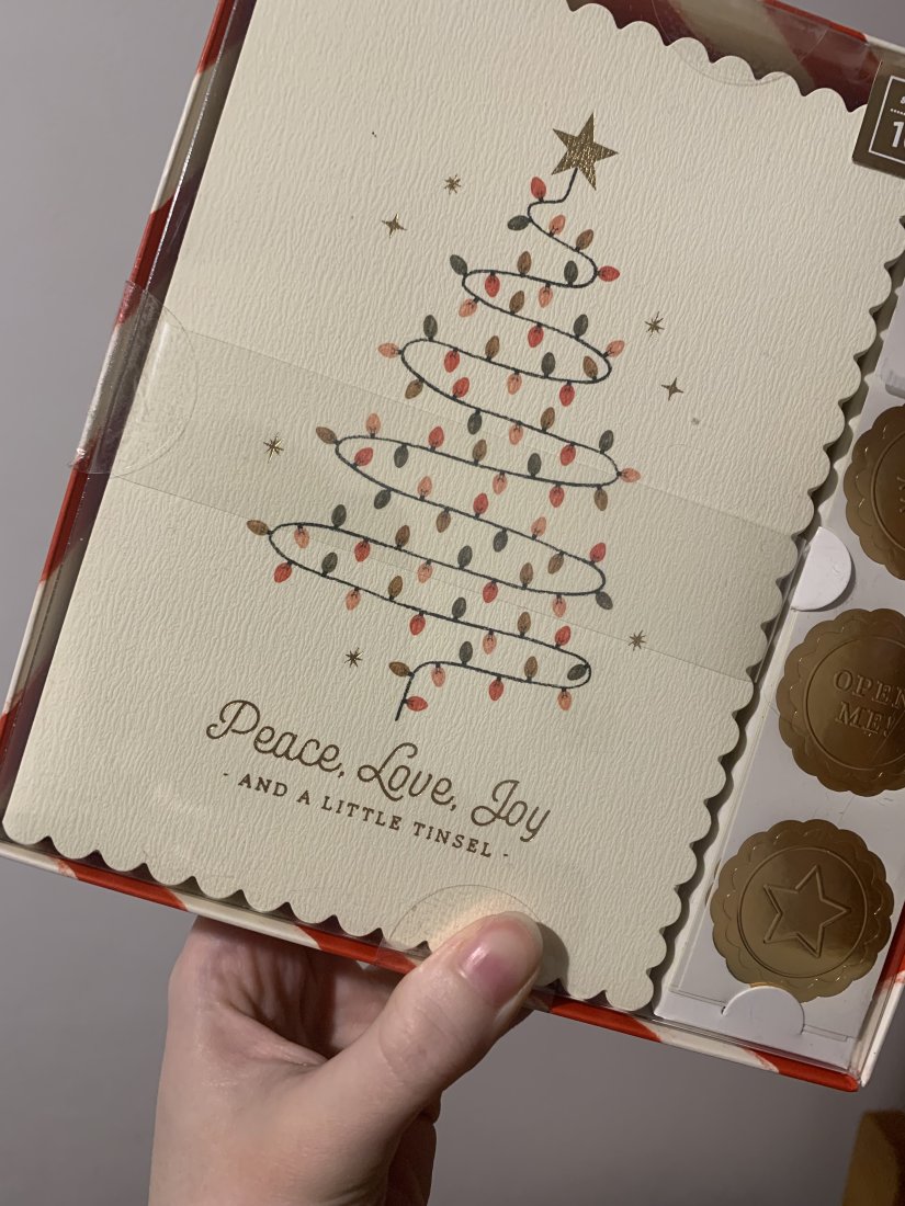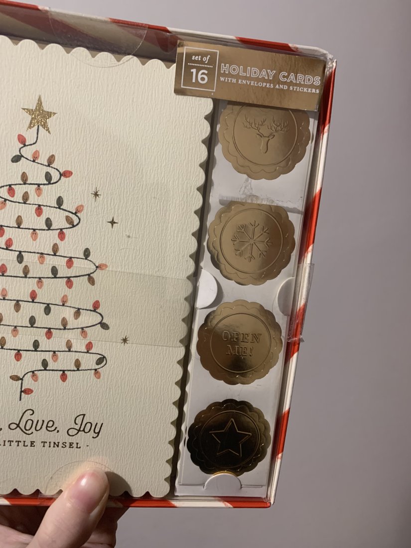 Zestaw kartek świątecznych wraz z kopertami i tłoczonymi naklejkami w formie pieczęci. Elegancki zestaw w pudełku, kartki wydrukowane na wysokiej jakości papierze.