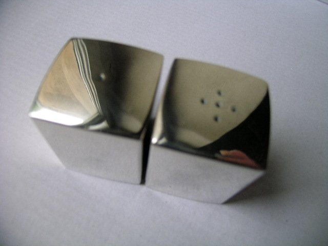 Solniczka i Pieprzniczka. Metalowe,być może to plater,ale pewna nie jestem. Nowoczesny ciekawy design. Eleganckie.Dość ciężkie i bardzo porządnie wykonane. Od spodu plasticzane zatyczki,wewnątrz również plastikowe wykończenie.Z zewnątrz błyszczące. Klasa.