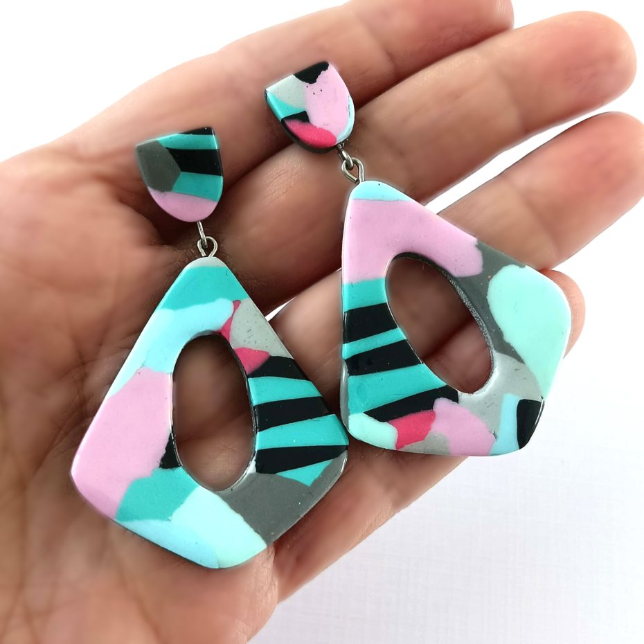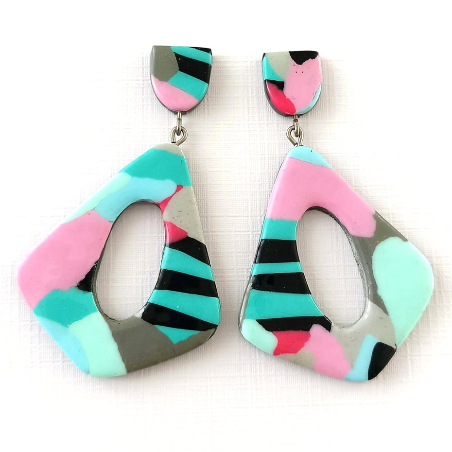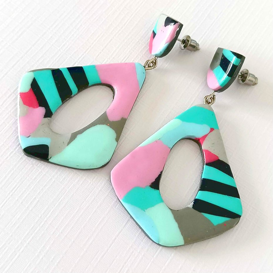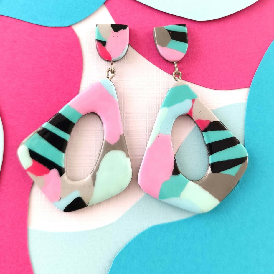 Nowoczesne, abstrakcyjne kolczyki statement dla miłośniczek odważnej, artystycznej biżuterii. Te unikatowe kolczyki łączą delikatne pastelowe kolory z graficznymi czarnymi paskami i geometrycznymi kształtami, tworząc efektowny, współczesny wygląd.