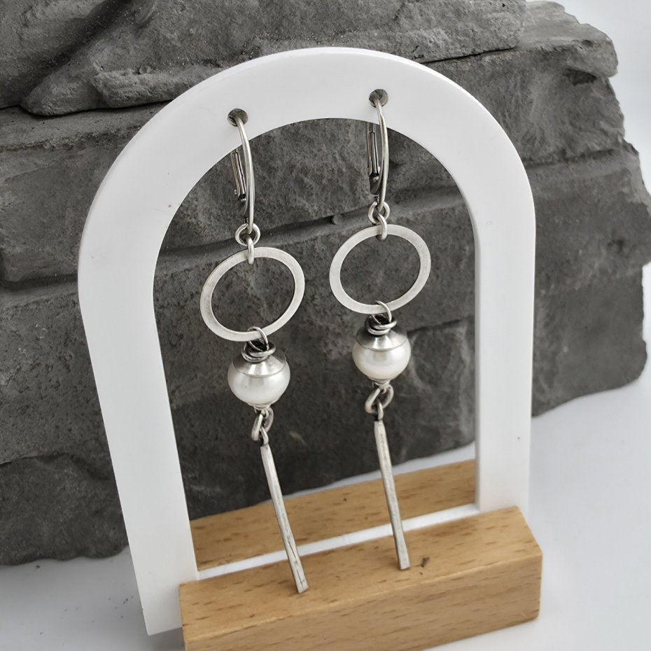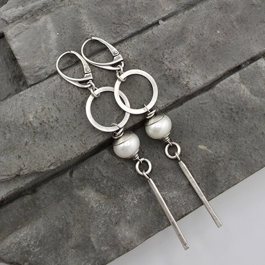 Nowoczesne, kobiece kolczyki na co dzień. Wykonane w całości z oksydowanego srebra próby 925 oraz białych pereł słodkowodnych wielkości ok. 10x7 mm. Wielkość kół nad perłami to 1,7 cm. Zapiecia typu angielskiego. Całkowita długość kolczyków to ok. 8,2 cm. Moge je także wykonać bez oksydy. Ozdobnie zapakowane.