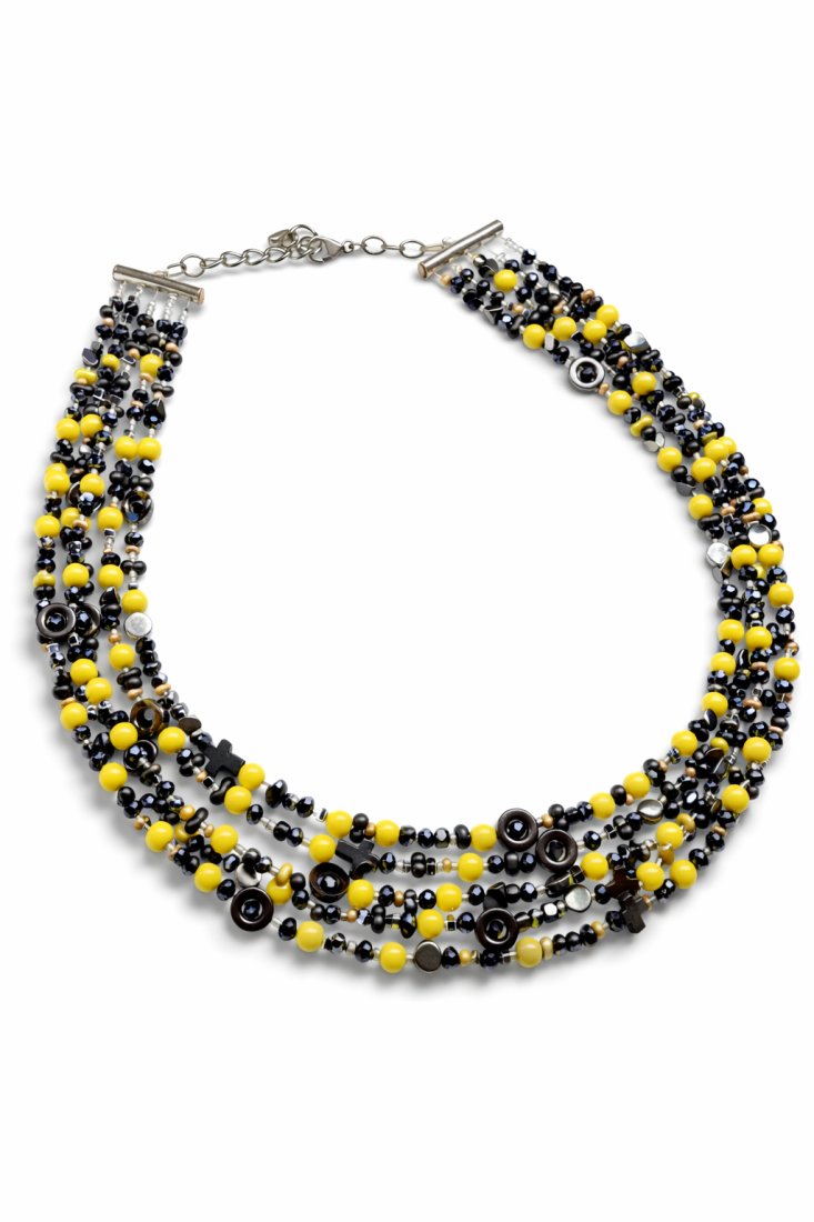Dodaj swojej stylizacji wyrazistego charakteru dzięki wielorzędowemu naszyjnikowi, który łączy surową elegancję hematytu z energetycznym, żółtym akrylem. Kompozycja pięciu subtelnych sznurów koralików tworzy efektowną kaskadę, która idealnie układa się na dekolcie. To biżuteria dla kobiet, które nie boją się wyróżniać i cenią nowoczesny design.