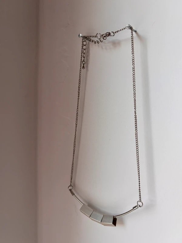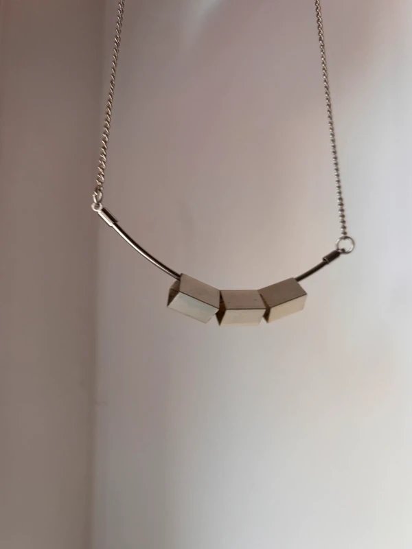 Nowoczesny naszyjnik o geometrycznym designie — wykonany ze stali nierdzewnej, z trzema metalicznymi kostkami osadzonymi na delikatnym łańcuszku.