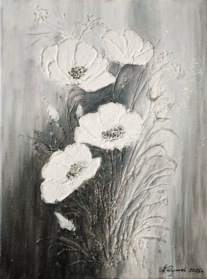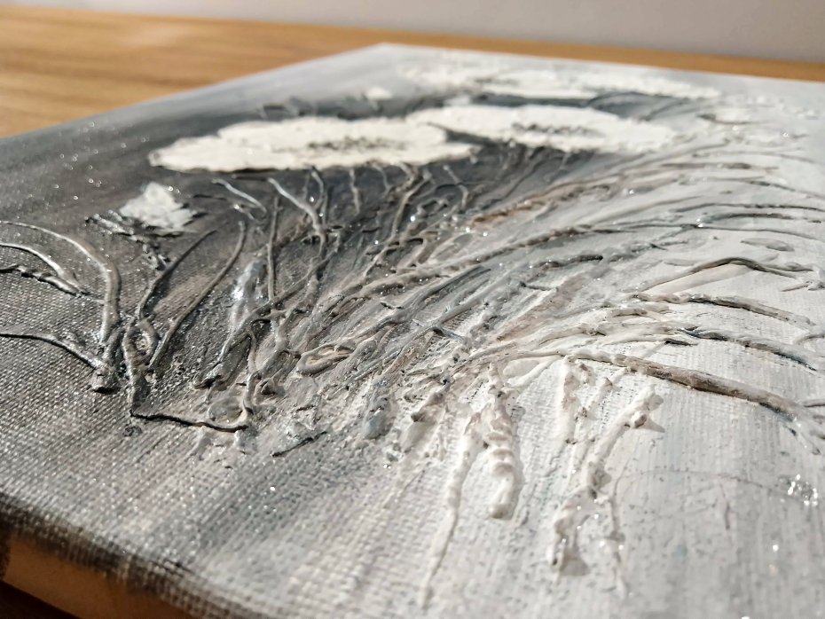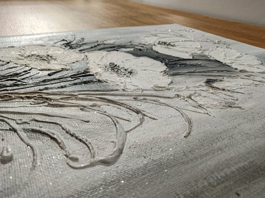 Obraz strukturalny, łączący w sobie nowoczesną formę z głęboką teksturą 3D dopełni wnętrze nutą luksusu dodając klasy i nowoczesnego blasku. Wyjątkowa kompozycja florystyczna w stylu "ombre", w której surowość szarości spotyka się z nieskazitelną bielą w subtelnie srebrzystym wykończeniu. Kwiaty zostały naniesione grubą warstwą pasty strukturalnej, dzięki czemu dosłownie "wychodzą z płótna", co daje efekt niesamowitej głębi. Obraz pięknie pracuje ze światłem, zmieniając swój wygląd w zależności od pory dnia. Praca została stworzona z myślą o wnętrzach, w których sztuka ma być nie tylko dekoracją, ale i namacalnym doświadczeniem. Każdy egzemplarz jest niepowtarzalny i jedyny w swoim rodzaju. Nie jest to wydruk, lecz autorskie dzieło z wyraźnym śladem ręki artysty.