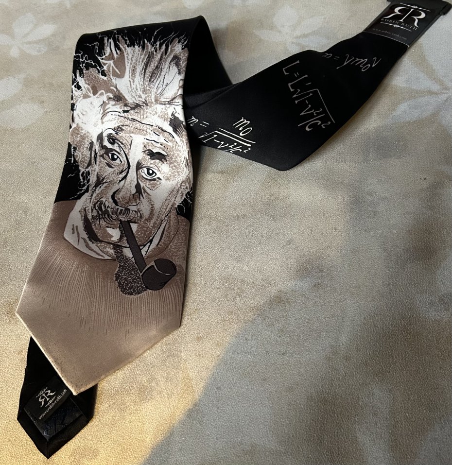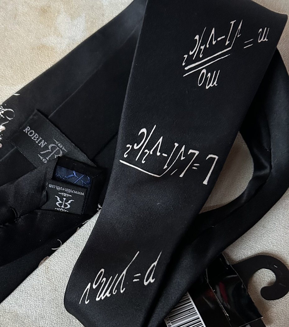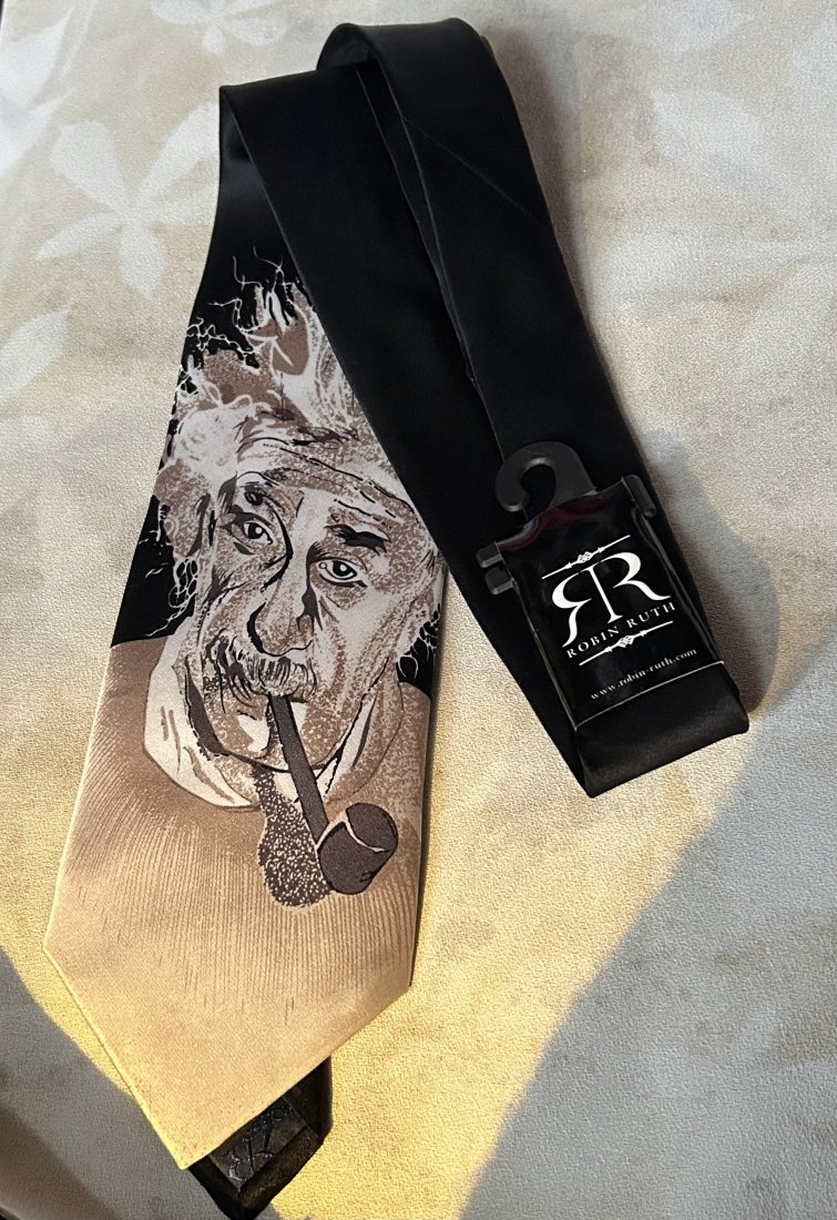 Nowy , wyjątkowy , oryginalny jedwabny krawat Z metkami - ROBIN RUTH 100 % SILK I ALBERT EINSTEIN i jego E= mc2 . Bardzo jakościowy , podszewka z logo , metki . Subtelny połysk. szerokość dolnego trójkąta prawie 10 cm Stan zachowania bardzo dobry - nowy do noszenia i na oryginalny prezent gotowy :)