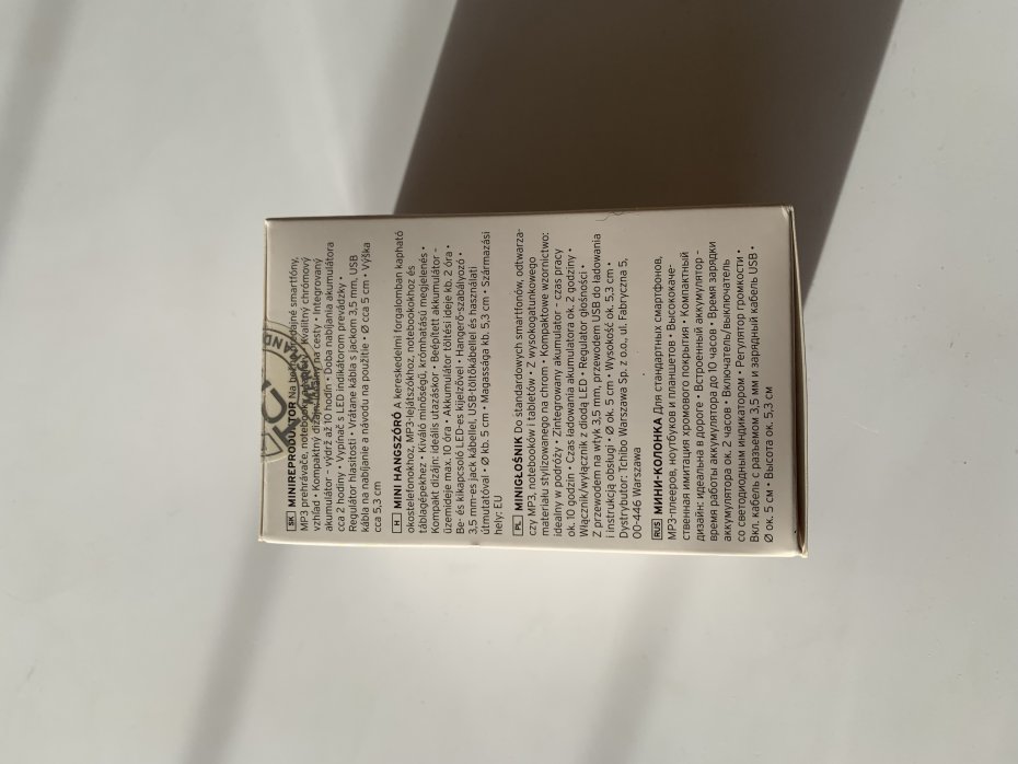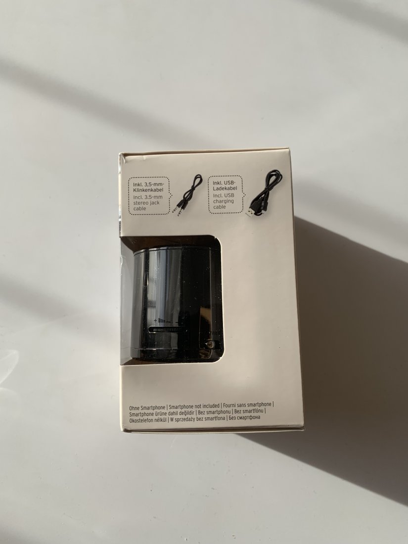 Głośnik mini. W zestawie kabel do ładowania (mcro-usb) oraz kabel do łączenia z telefonem (jack). Głośnik posiada wbudowany akumulator, a więc nie musi być podłączony do sieci w trakcie użytkowania, ale musi być połączony z urządzeniem emitującym dźwięk. Kolor według producenta szary, według mnie brązowy, na dole podświetlenie, które pomaga namierzyć głośnik w ciemności.
