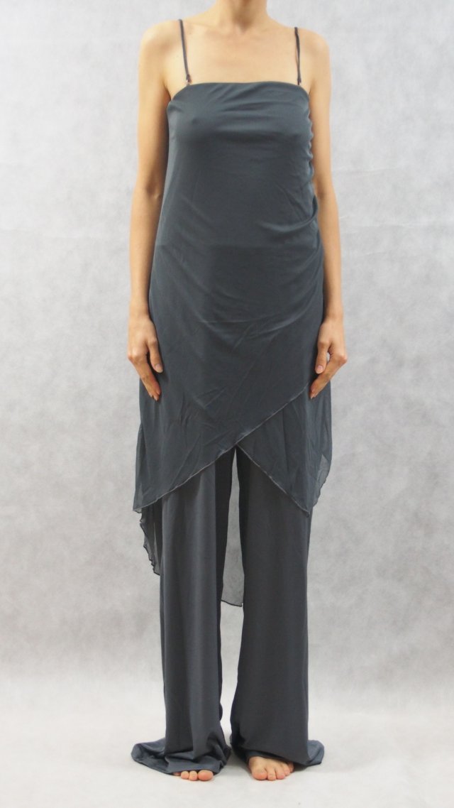 Piękny zwiewny kombinezon w kolorze metalicznej szarości. U góry siateczka, która wysmukli sylwetkę, nada jej lekkości. Możliwość noszenia z ramiączkami lub ich odpięcia.