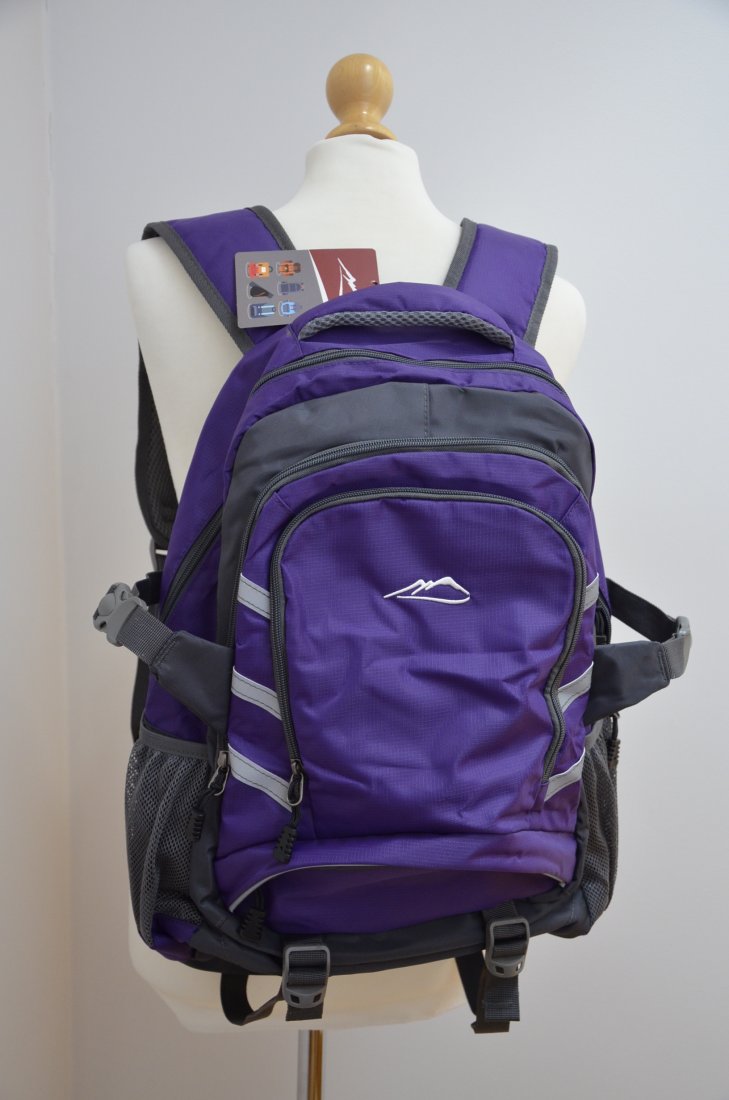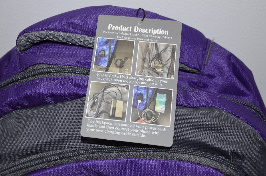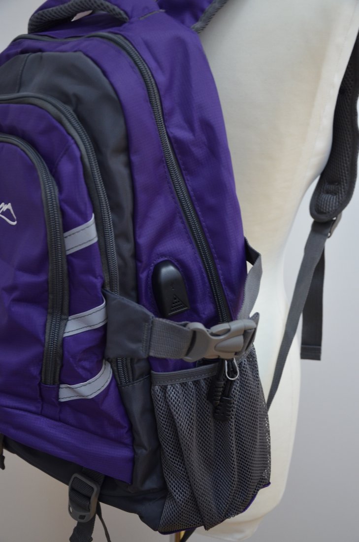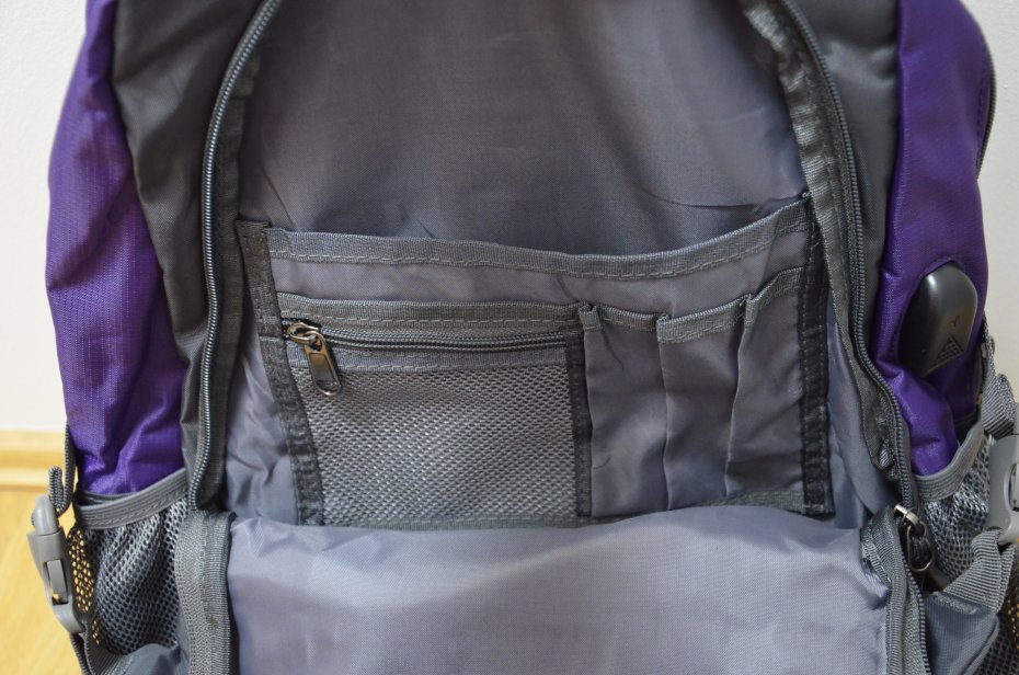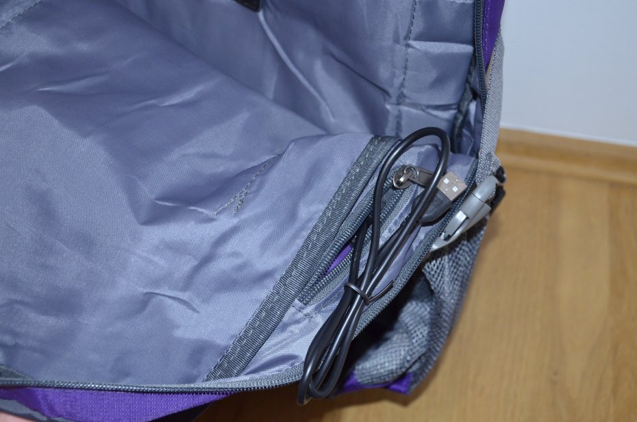 dużo kieszeni, w tym przegroda na laptopa; ma wbudowany port USB np. na powerbanka