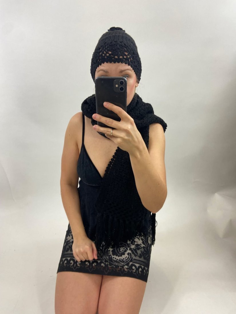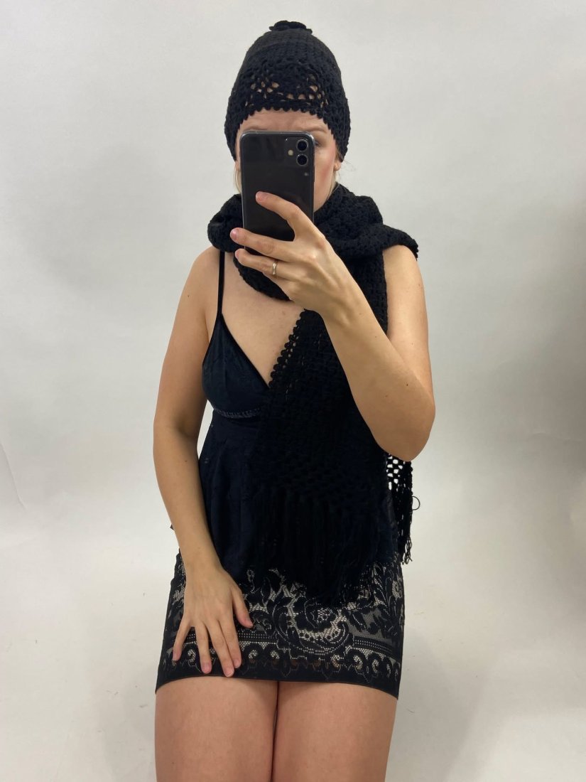 Uroczy, wykonany na szydełku zestaw. Czapka+ szal. Włóczka raczej akrylowa, miękka. Całość przepiękna.