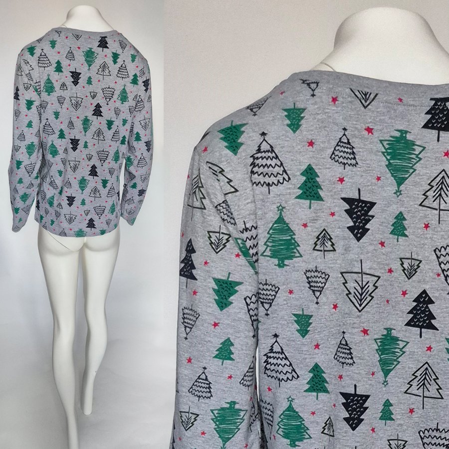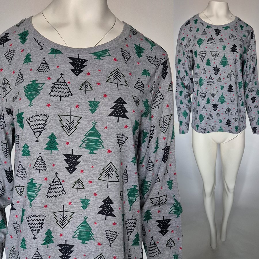 bluzka świąteczna, bluzka zimowa, bluzka z choinkami, bluzka szara, bluzka damska, świąteczny motyw, bożonarodzeniowa bluzka, długi rękaw, bawełniana bluzka, bluzka na święta, zimowy print, casual, bluzka 38/40, longsleeve damski