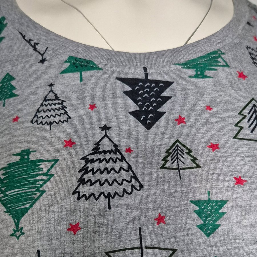 Urocza bluzka damska z długim rękawem, idealna na sezon zimowy i świąteczny. Wykonana z przyjemnej, szarej dzianiny z nadrukiem choinek w odcieniach zieleni i czerni oraz drobnymi czerwonymi gwiazdkami.