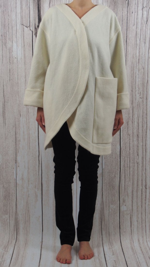 Cudowny wełniany oversizowy ekskluzywny płaszczyk. Milutki w dotyku, jedna obszerna kieszeń. Zapinany na kryte guziczki. Wykonany z wełny moim zdaniem w połączeniu z kaszmirem, ew. angorą.