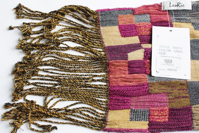 Przedstawiam Państwu luksusowy miękki szal duńskiej marki LauRie. Nowy, z metką. Cena na metce to 399 DKK (ponad 220 zł). Szal wykonany z wiskozy.