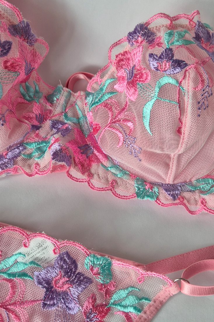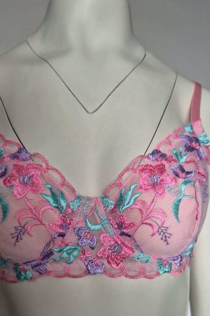Delikatny, zmysłowy komplet bielizny w kolorze różowym z pięknym, wielokolorowym haftem kwiatowym. Biustonosz wykonany z transparentnej miękkiej siateczki, zdobiony efektownym haftem w odcieniach różu, turkusu i fioletu. Miseczki od spodu wykończone dodatkową warstwą siateczki. Regulowane ramiączka i zapięcie z tyłu na 2 haftki, z 3-stopniową regulacją pozwalają idealnie dopasować go do sylwetki.
