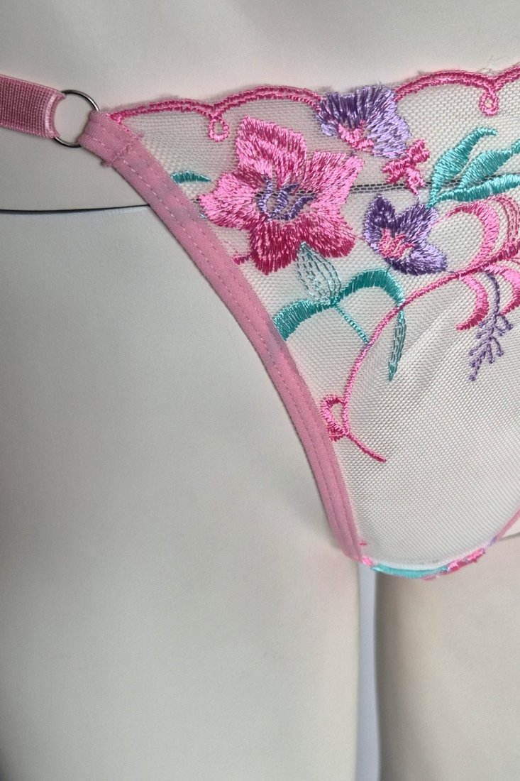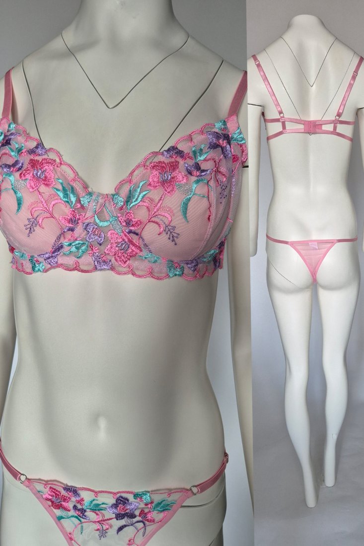 komplet bielizny, różowy komplet, haftowana bielizna, zmysłowa bielizna, stringi, biustonosz siateczka, kwiatowy haft, komplet różowy, delikatna bielizna, sexy lingerie, bielizna transparentna, haft kwiatowy, komplet koronkowy, bielizna damska