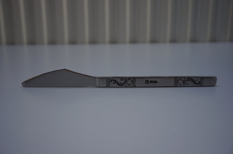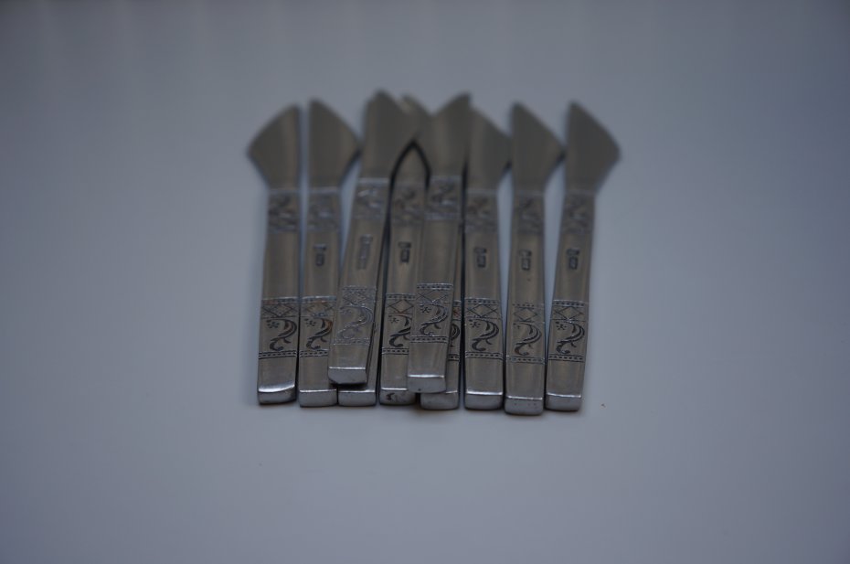 Noże nierdzewne - 10 sztuk. Uchwyt grawerowany. Vintage. Wykonane w byłym Związku Radzieckim - późne lata 70 XX w. Sygnowane. Stan widoczny na zdjęciu.