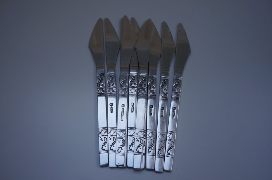 Noże nierdzewne - 10 sztuk. Uchwyt grawerowany. Vintage. Wykonane w byłym Związku Radzieckim - późne lata 70 XX w. Sygnowane. Stan widoczny na zdjęciu.