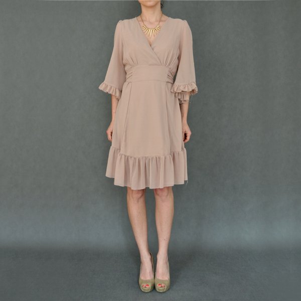 Przepiękna sukienka w kolorze nude. Po bokach talii odchodzą szarfy do wiązania z tyłu kokardy. Rękawki szersze, wykończone falbanką. Dekolt kopertowy. Z tyłu zip. Polecam bardzo.