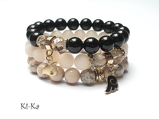 Komplet trzech bransoletek wykonanych z naturalnych kamieni - matowe jadeity [10mm] ,howlity [10mm] ,fasetowane kuleczki kwarców ze złotymi drobinkami [10mm], onyks [10mm], kryształków fasetowanych [10 x 8mm] oraz elementów metalowych w kolorze tzw.różowego złota.Bransoletki pasują na nadgarstek 16-17cm. Biżuteria ozdobnie zapakowana. Model sprzedany - podobny do wykonania na zamówienie. Wcześniej prosimy o kontakt.