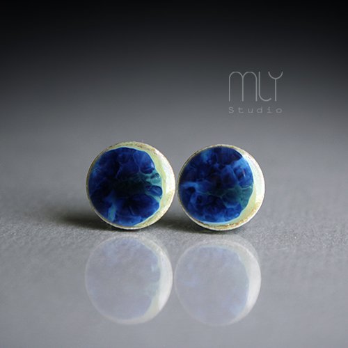 Ceramiczne okrągłe kolczyki w formie sztyftów, ręcznie wykonane z delikatnej gliny kamionkowej, jednostronnie szkliwione mieszanką błękitnych i zielonych szkliw z efektem plamek, na antyalergicznych sztyftach w kolorze srebrnym. Średnica ok. 11mm. Polecam