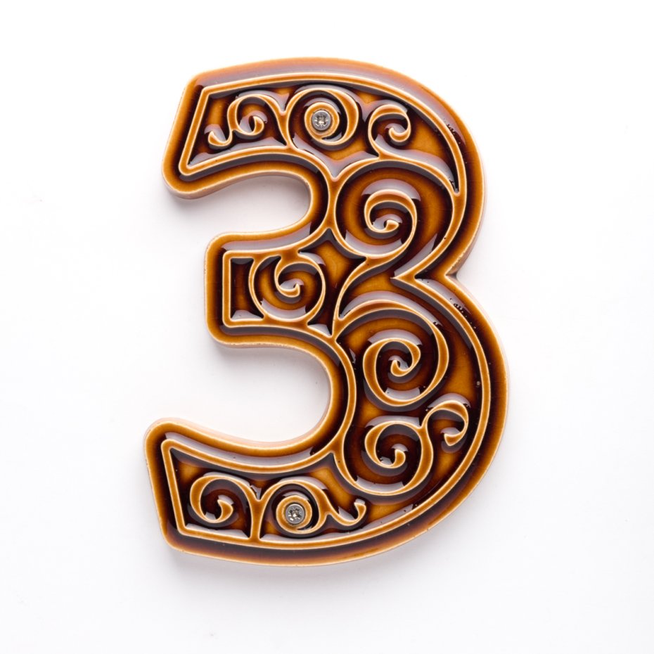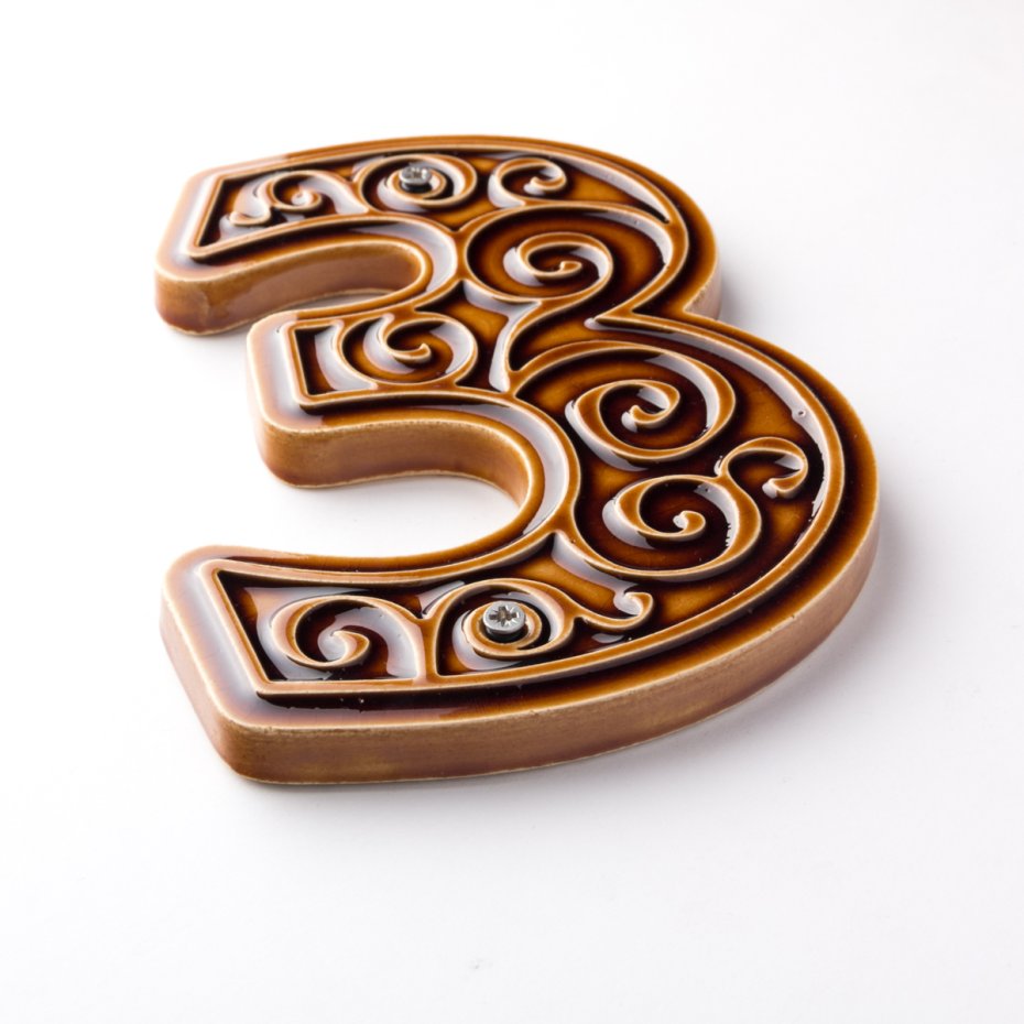 Ceramiczna cyfra z lekko wypukłym, dekoracyjnym ornamentem. Ręcznie wykonana z jasnej gliny, pokryta błyszczącym szkliwem. Dwukrotnie wypalana w wysokiej temperaturze.