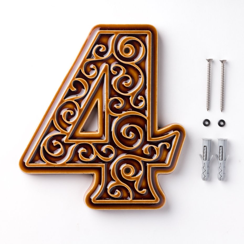 Ceramiczna cyfra z lekko wypukłym, dekoracyjnym ornamentem. Ręcznie wykonana z jasnej gliny, pokryta błyszczącym szkliwem. Dwukrotnie wypalana w wysokiej temperaturze.