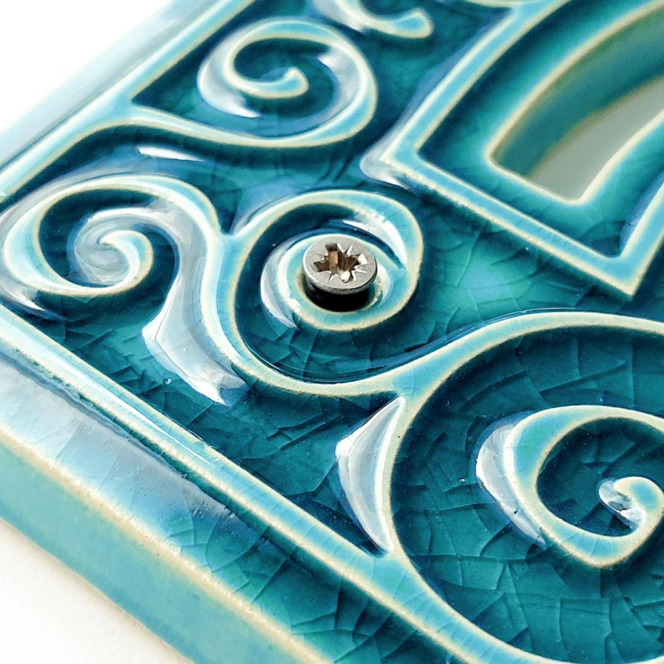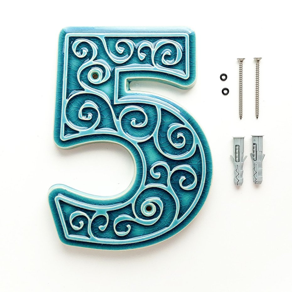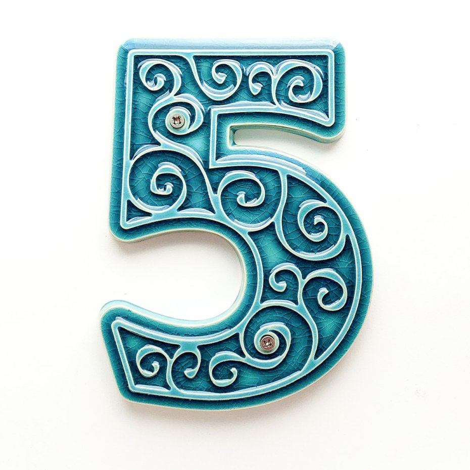 Ceramiczna cyfra z lekko wypukłym, dekoracyjnym ornamentem. Ręcznie wykonana z jasnej gliny, pokryta błyszczącym szkliwem. Dwukrotnie wypalana w wysokiej temperaturze.