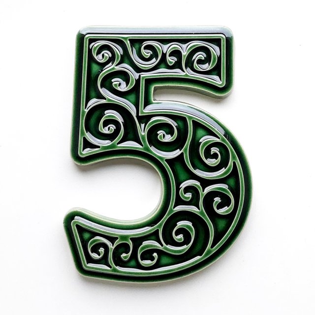 Ceramiczna cyfra 5 z ozdobnym ornamentem, do zamocowania na elewacji budynku. Wykonana z jasnej gliny, pokryta błyszczącym szkliwem, wypalana dwukrotnie w wysokiej temperaturze. Do klejenia cyfry można stosować kleje montażowe odporne na działanie warunków atmosferycznych. Unieruchomienie cyfry na czas schnięcia kleju umożliwia krawędziowy kołnierz od spodu cyfry.