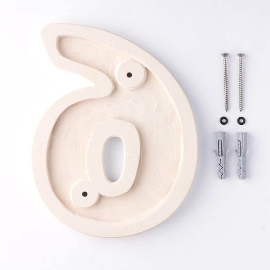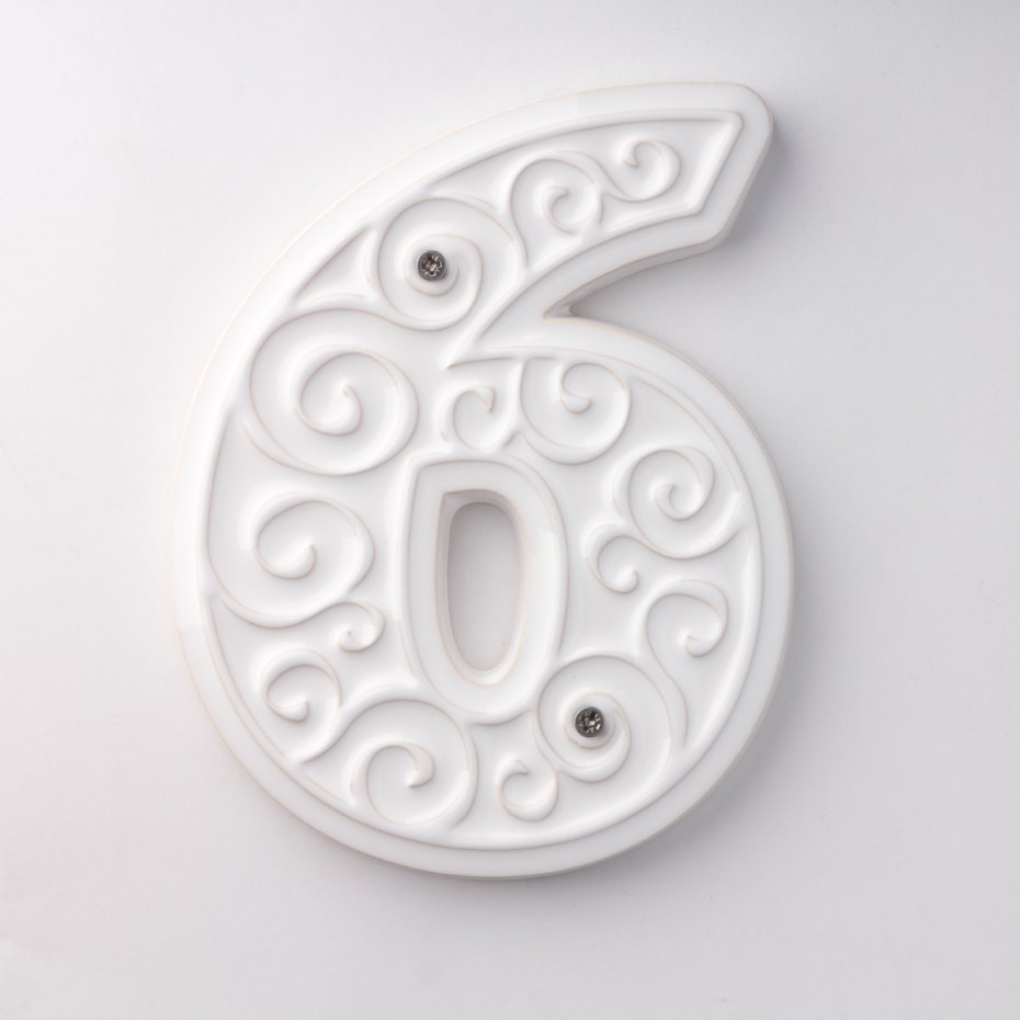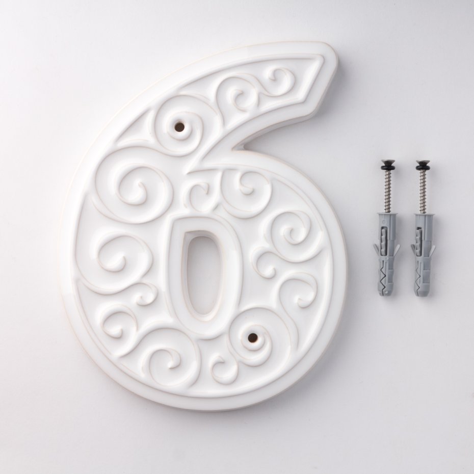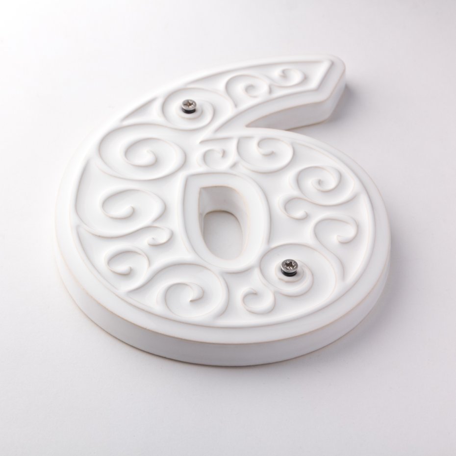 Ceramiczna cyfra z lekko wypukłym, dekoracyjnym ornamentem. Ręcznie wykonana z jasnej gliny, pokryta błyszczącym szkliwem. Dwukrotnie wypalana w wysokiej temperaturze.