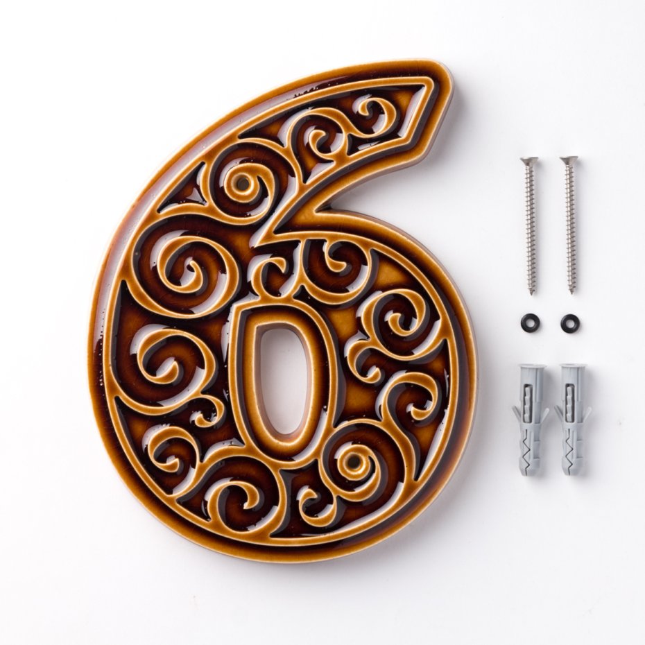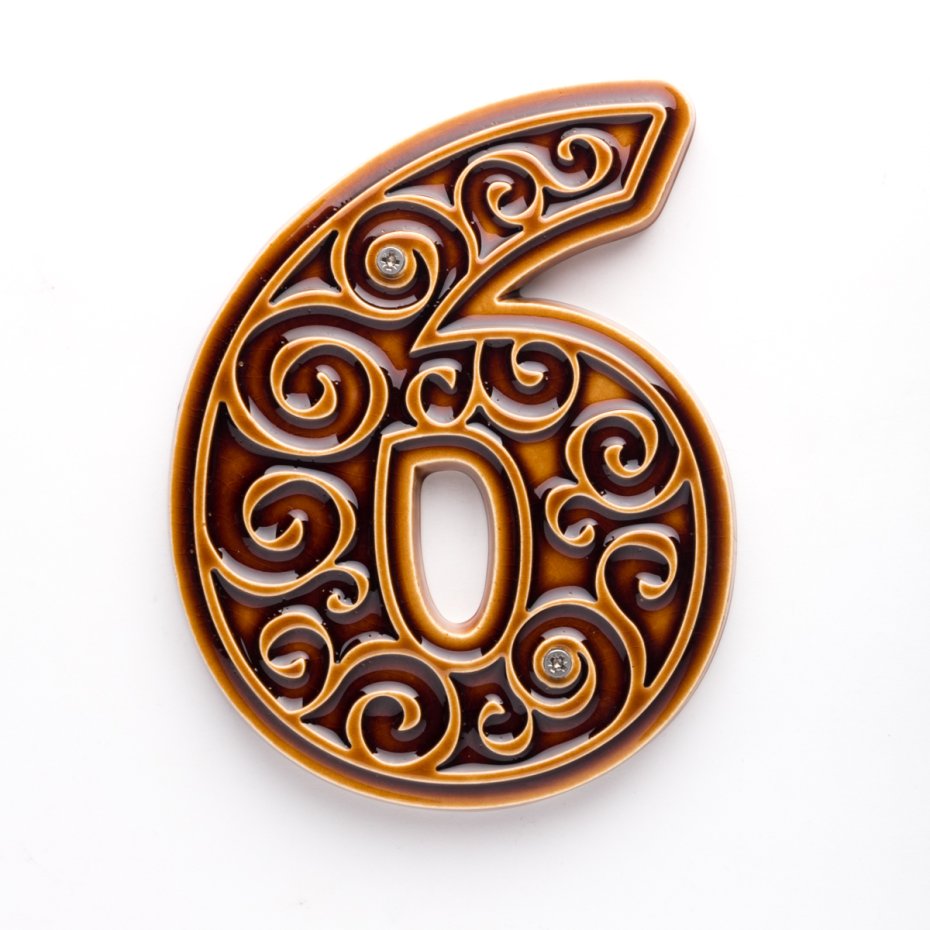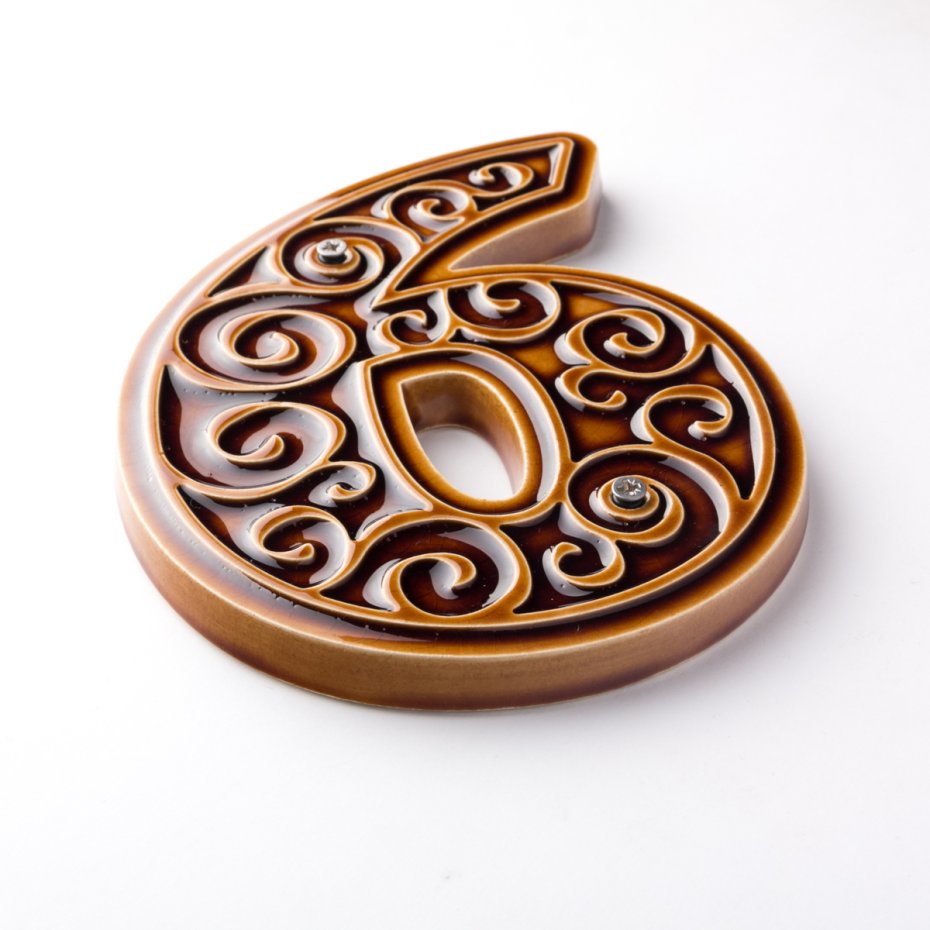 Ceramiczna cyfra z lekko wypukłym, dekoracyjnym ornamentem. Ręcznie wykonana z jasnej gliny, pokryta błyszczącym szkliwem. Dwukrotnie wypalana w wysokiej temperaturze.